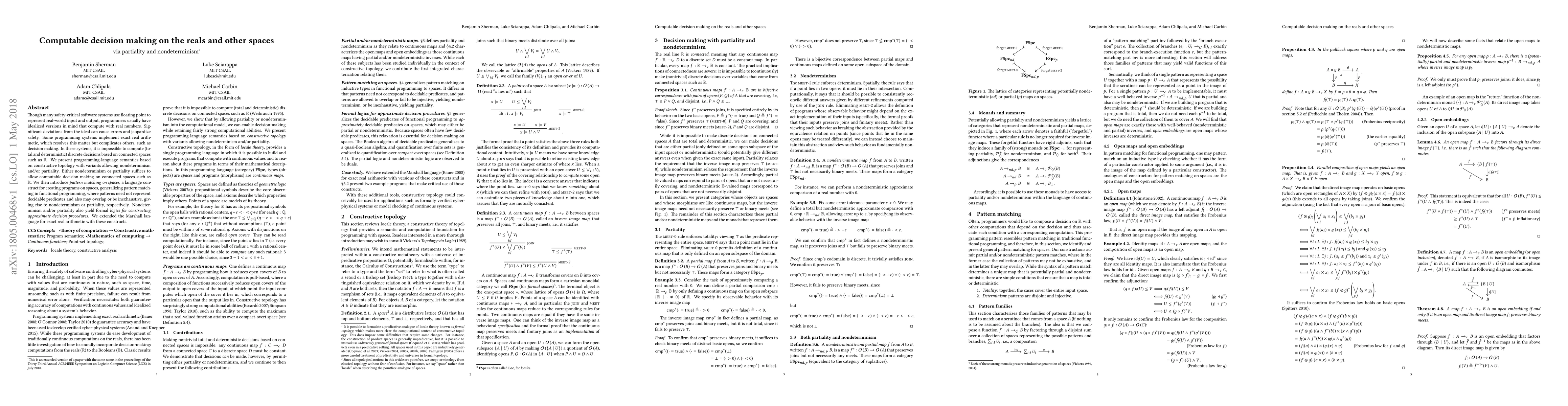 Though many safety-critical software systems use floating point to represent real-world input and output, programmers usually have idealized versions in mind that compute with real numbers. Significant deviations from the ideal can cause errors and jeopardize safety. Some programming systems implement exact real arithmetic, which resolves this matter but complicates others, such as decision making. In these systems, it is impossible to compute (total and deterministic) discrete decisions based on connected spaces such as $\mathbb{R}$. We present programming-language semantics based on constructive topology with variants allowing nondeterminism and/or partiality. Either nondeterminism or partiality suffices to allow computable decision making on connected spaces such as $\mathbb{R}$. We then introduce pattern matching on spaces, a language construct for creating programs on spaces, generalizing pattern matching in functional programming, where patterns need not represent decidable predicates and also may overlap or be inexhaustive, giving rise to nondeterminism or partiality, respectively. Nondeterminism and/or partiality also yield formal logics for constructing approximate decision procedures. We implemented these constructs in the Marshall language for exact real arithmetic.