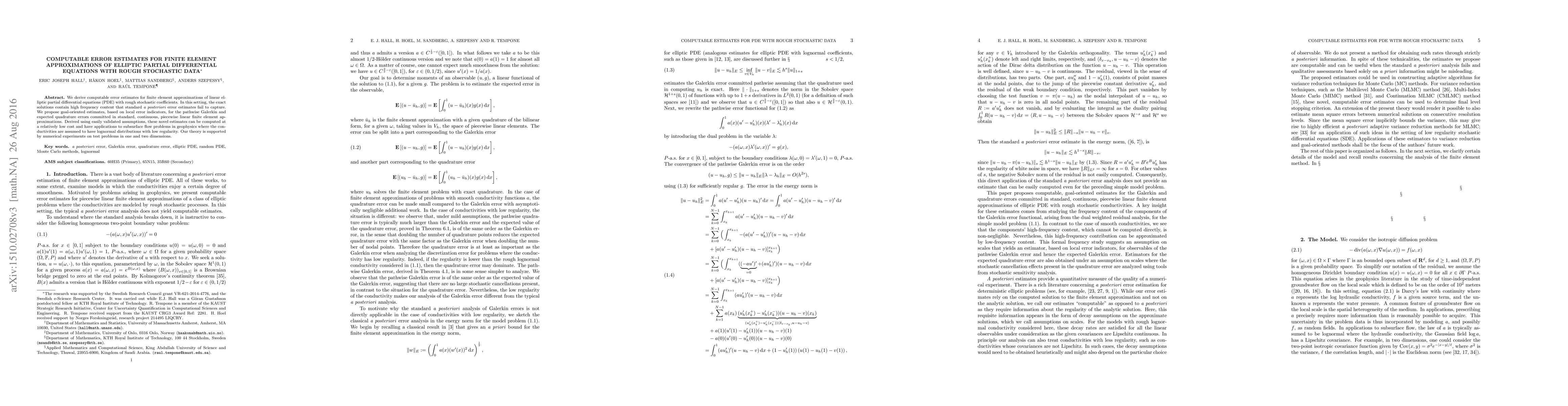 This paper develops computable error estimates for finite element approximations of elliptic PDEs with stochastic coefficients, proposing goal-oriented estimates that capture high-frequency content. These estimates are validated through numerical experiments and have applications in subsurface flow problems in geophysics.