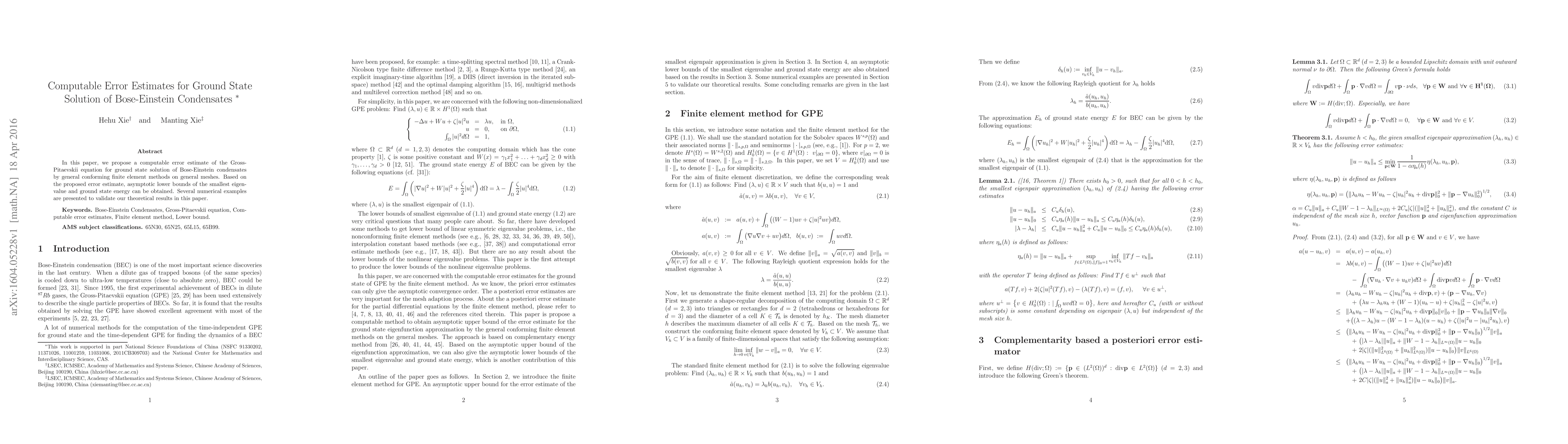 This paper proposes a computable error estimate for the Gross-Pitaevskii equation using conforming finite element methods, providing asymptotic lower bounds for the smallest eigenvalue and ground state energy of Bose-Einstein condensates. Numerical examples validate the theoretical results.