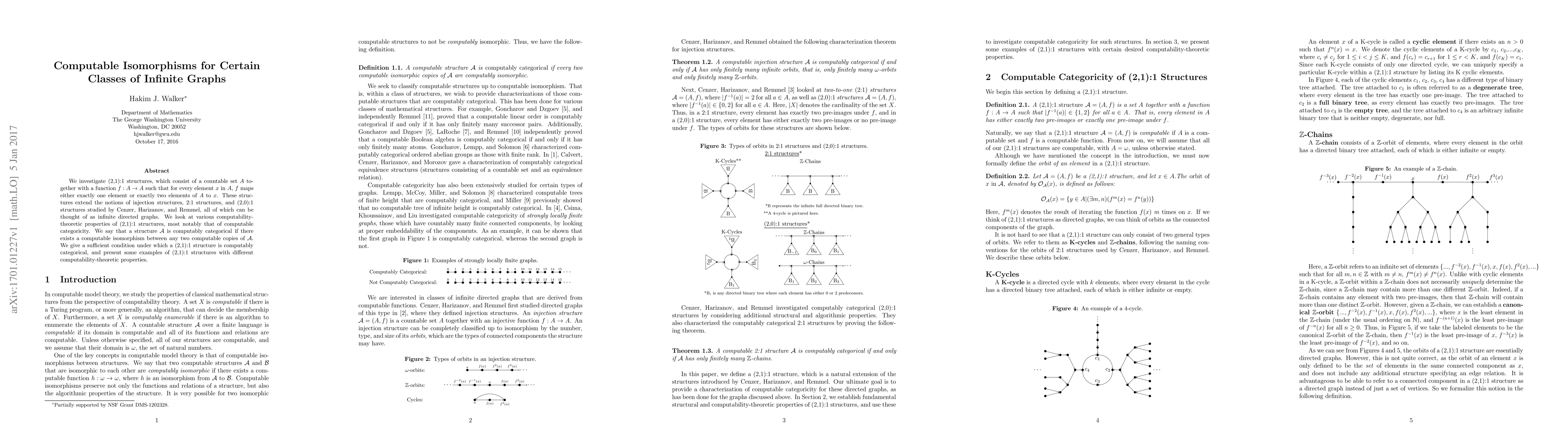 We investigate (2,1):1 structures, which consist of a countable set $A$ together with a function $f: A \to A$ such that for every element $x$ in $A$, $f$ maps either exactly one element or exactly two elements of $A$ to $x$. These structures extend the notions of injection structures, 2:1 structures, and (2,0):1 structures studied by Cenzer, Harizanov, and Remmel, all of which can be thought of as infinite directed graphs. We look at various computability-theoretic properties of (2,1):1 structures, most notably that of computable categoricity. We say that a structure $\mathcal{A}$ is computably categorical if there exists a computable isomorphism between any two computable copies of $\mathcal{A}$. We give a sufficient condition under which a (2,1):1 structure is computably categorical, and present some examples of (2,1):1 structures with different computability-theoretic properties.