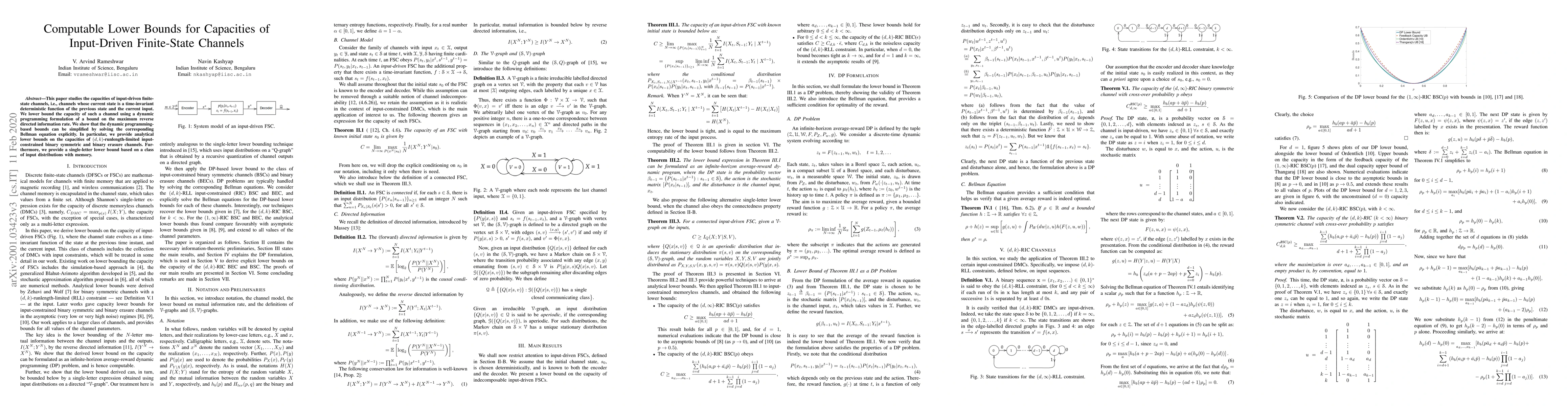 This paper establishes computable lower bounds for the capacities of input-driven finite-state channels using dynamic programming and Bellman equations, providing analytical results for specific types of binary channels and introducing a novel single-letter lower bound based on memory-aware input distributions.
