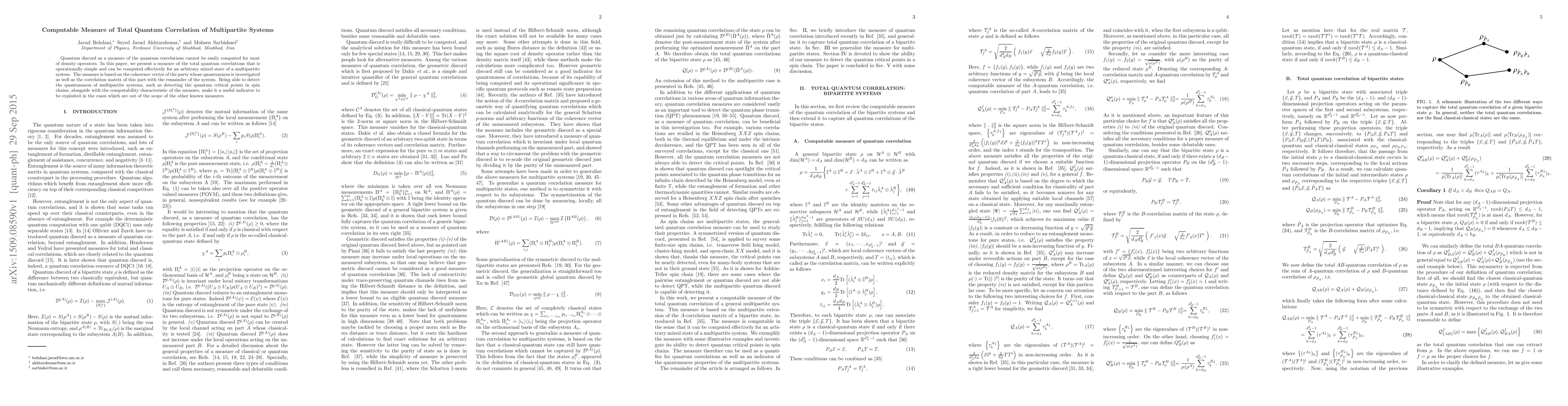 This paper introduces a computable measure for total quantum correlations in multipartite systems, based on coherence vectors and correlation matrices. This measure is operationally simple and effective for any mixed state, making it useful for detecting quantum critical points in spin chains and beyond.