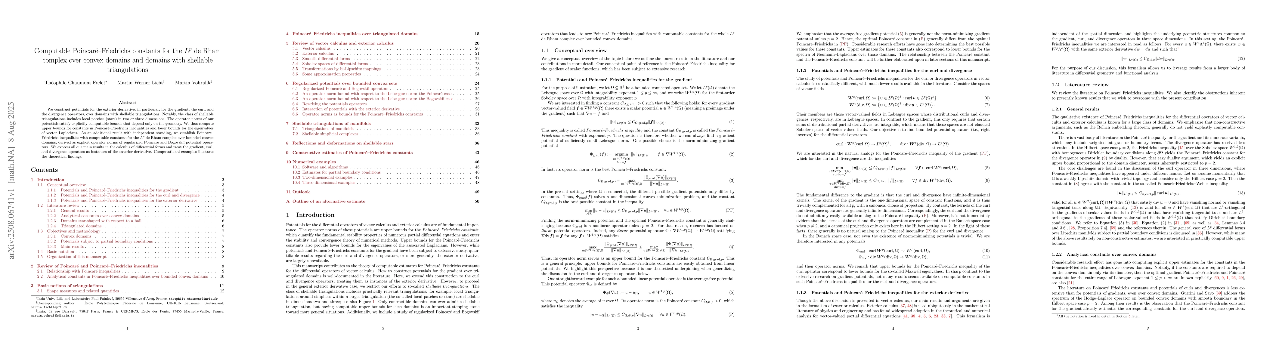 We construct potentials for the exterior derivative, in particular, for the gradient, the curl, and the divergence operators, over domains with shellable triangulations. Notably, the class of shellable triangulations includes local patches (stars) in two or three dimensions. The operator norms of our potentials satisfy explicitly computable bounds that depend only on the geometry. We thus compute upper bounds for constants in Poincar\'e--Friedrichs inequalities and lower bounds for the eigenvalues of vector Laplacians. As an additional result with independent standing, we establish Poincar\'e--Friedrichs inequalities with computable constants for the $L^{p}$ de~Rham complex over bounded convex domains, derived as explicit operator norms of regularized Poincar\'e and Bogovski\u{\i} potential operators. We express all our main results in the calculus of differential forms and treat the gradient, curl, and divergence operators as instances of the exterior derivative. Computational examples illustrate the theoretical findings.
