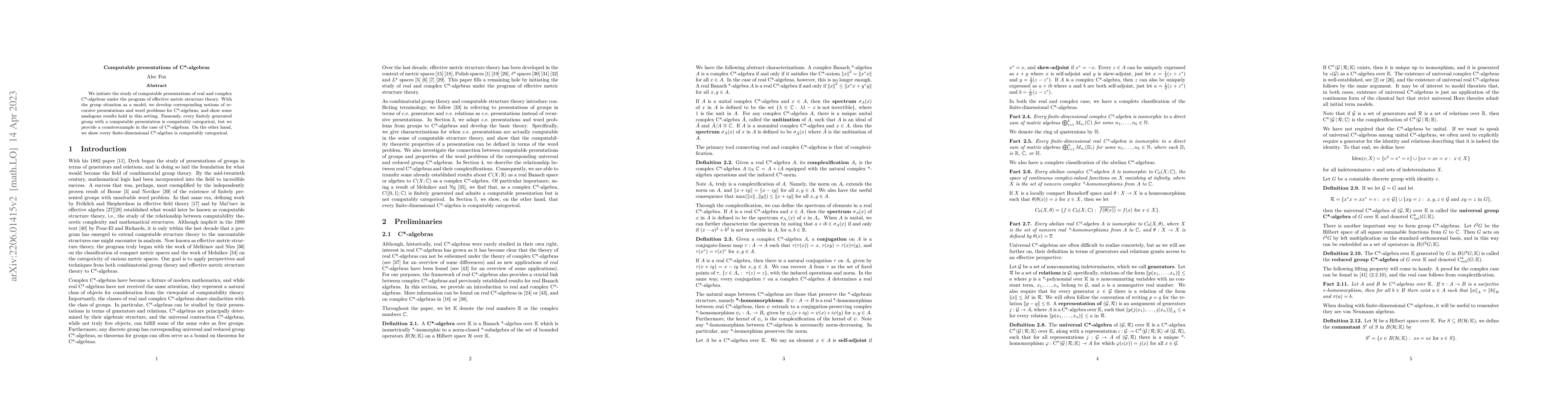 We initiate the study of computable presentations of real and complex C*-algebras under the program of effective metric structure theory. With the group situation as a model, we develop corresponding notions of recursive presentations and word problems for C*-algebras, and show some analogous results hold in this setting. Famously, every finitely generated group with a computable presentation is computably categorical, but we provide a counterexample in the case of C*-algebras. On the other hand, we show every finite-dimensional C*-algebra is computably categorical.