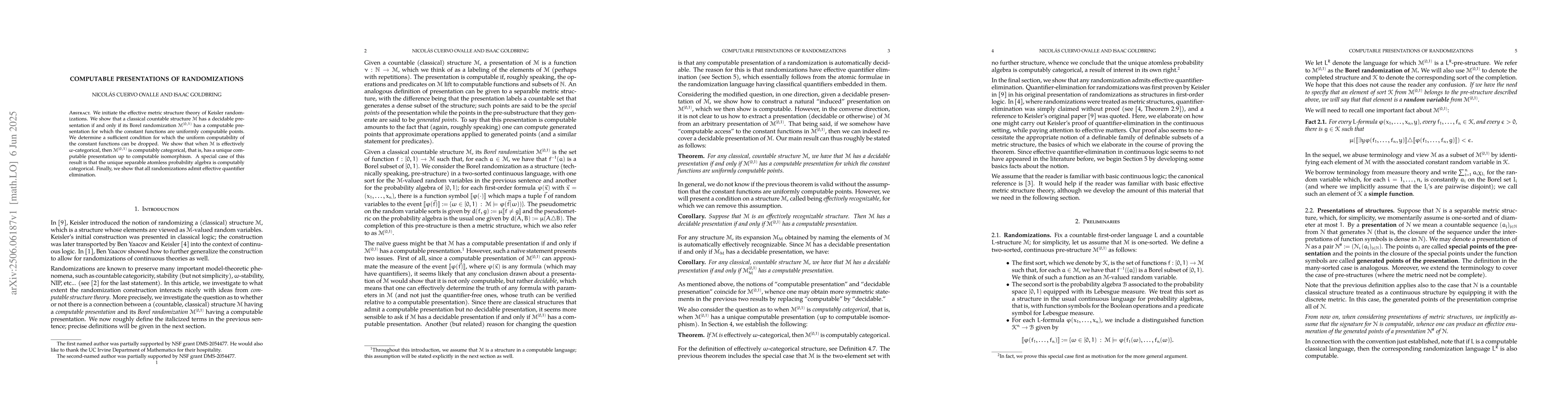 A research paper introduces a new approach to randomization theory, showing that certain classical structures have decidable presentations if their randomized counterparts have computable presentations with uniformly computable constant functions. The paper also establishes conditions under which this is true and demonstrates the existence of effective quantifier elimination in randomizations.