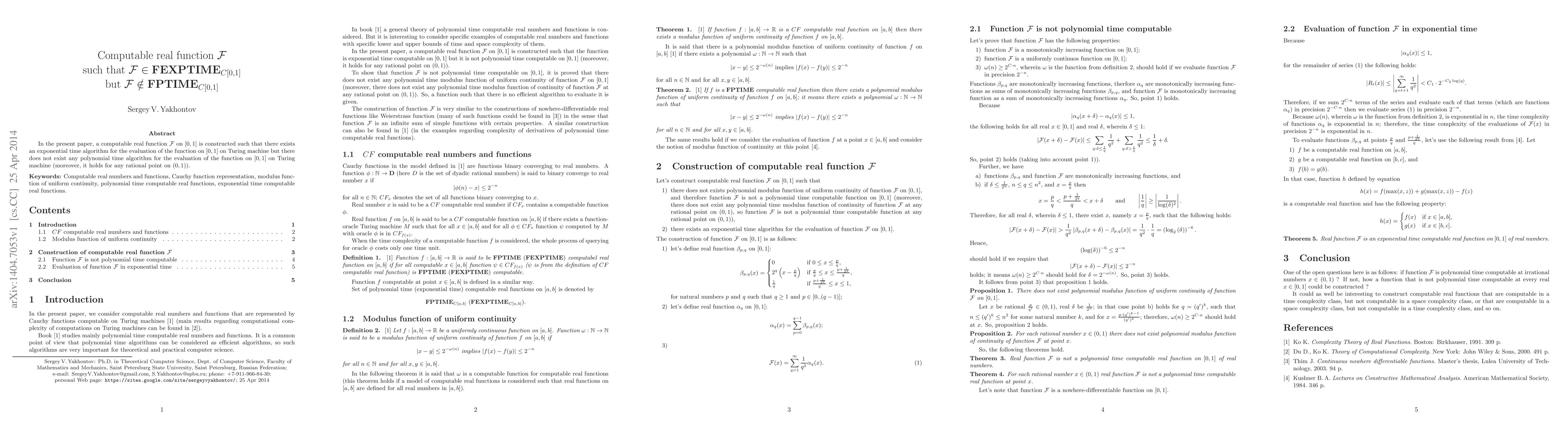 A computable real function F on [0,1] is constructed such that there exists an exponential time algorithm for the evaluation of the function on [0,1] on Turing machine but there does not exist any polynomial time algorithm for the evaluation of the function on [0,1] on Turing machine (moreover, it holds for any rational point on (0,1))