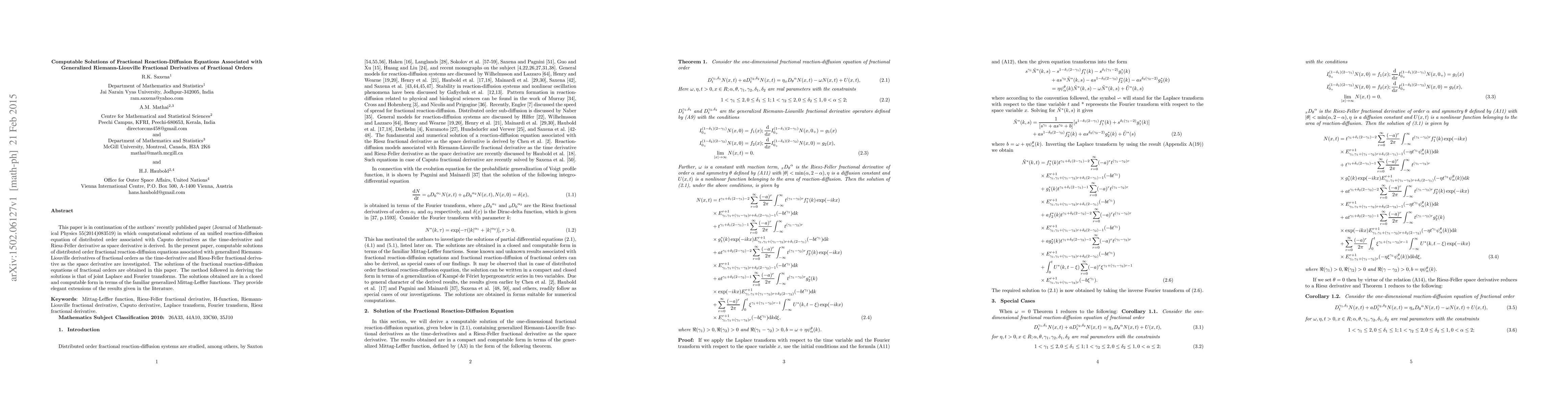 This paper investigates computable solutions for fractional reaction-diffusion equations using generalized Riemann-Liouville derivatives for time-derivatives and Riesz-Feller derivatives for space-derivatives. Solutions are derived using joint Laplace and Fourier transforms, yielding closed-form results expressed in generalized Mittag-Leffler functions.