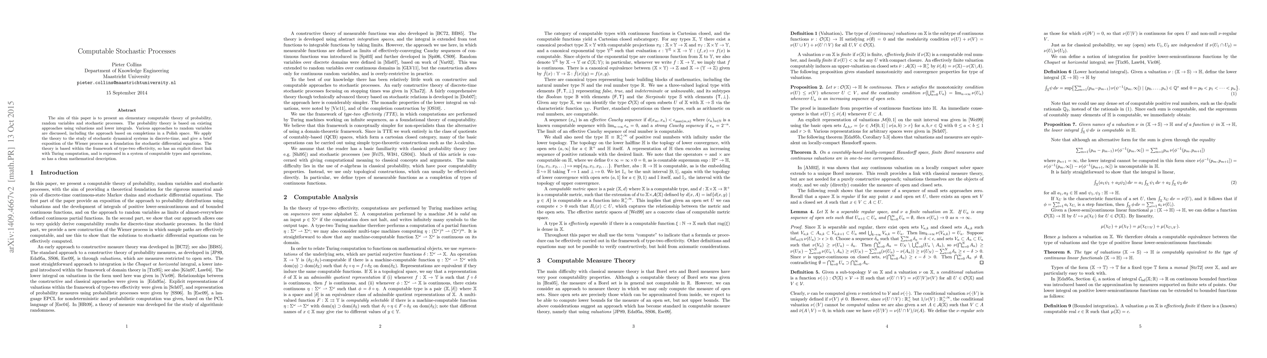 The aim of this paper is to present an elementary computable theory of probability, random variables and stochastic processes. The probability theory is baed on existing approaches using valuations and lower integrals. Various approaches to random variables are discussed, including the approach based on completions in a Polish space. We apply the theory to the study of stochastic dynamical systems in discrete-time, and give a brief exposition of the Wiener process as a foundation for stochastic differential equations. The theory is based within the framework of type-two effectivity, so has an explicit direct link with Turing computation, and is expressed in a system of computable types and operations, so has a clean mathematical description.