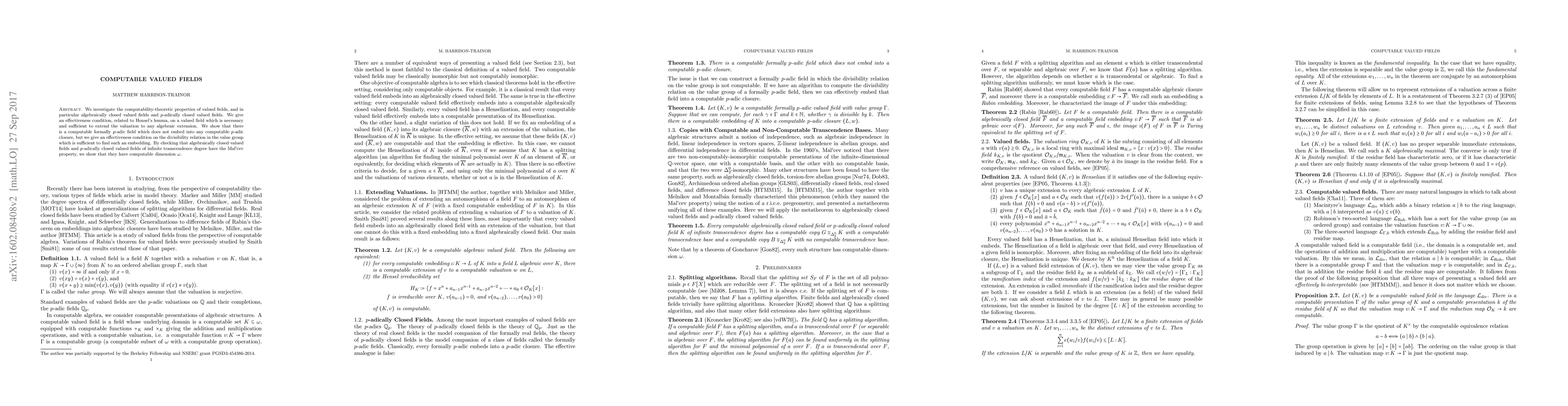 This paper explores the computability-theoretic properties of valued fields, focusing on algebraically closed and $p$-adically closed valued fields. It establishes an effectiveness condition for extending valuations to algebraic extensions and demonstrates that certain computable $p$-adic fields lack embeddings into computable $p$-adic closures, though it provides a condition for finding such embeddings.