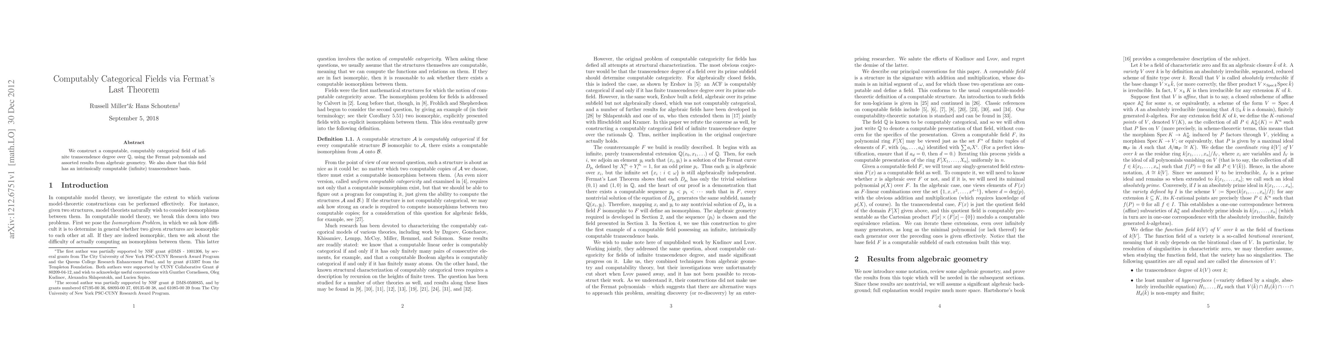 We construct a computable, computably categorical field of infinite transcendence degree over the rational numbers, using the Fermat polynomials and assorted results from algebraic geometry. We also show that this field has an intrinsically computable (infinite) transcendence basis.