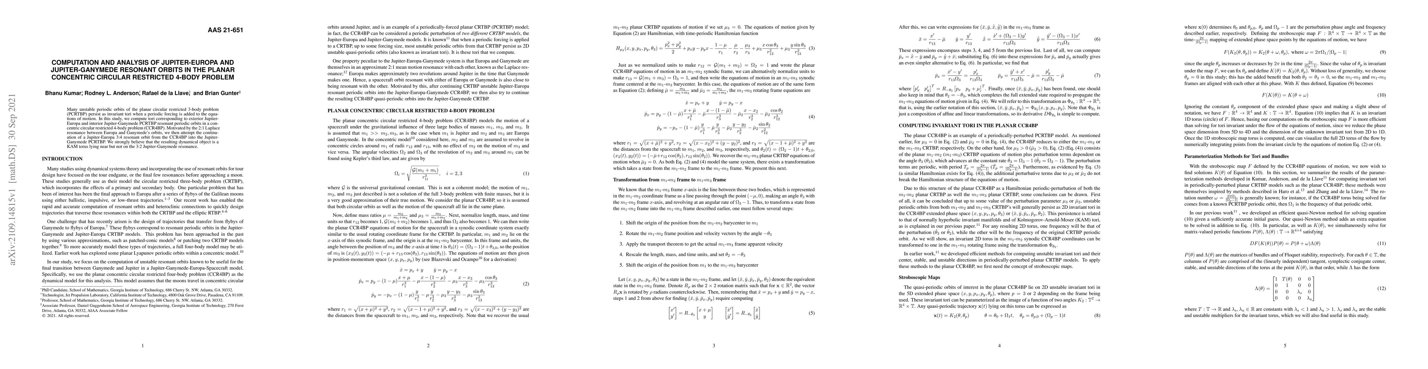 This paper computes and analyzes resonant orbits in the Jupiter-Europa and Jupiter-Ganymede systems, extending a Jupiter-Europa 3:4 resonant orbit from the concentric circular restricted 4-body problem (CCR4BP) into the Jupiter-Ganymede context, hypothesizing the existence of a KAM torus near the 3:2 Jupiter-Ganymede resonance.