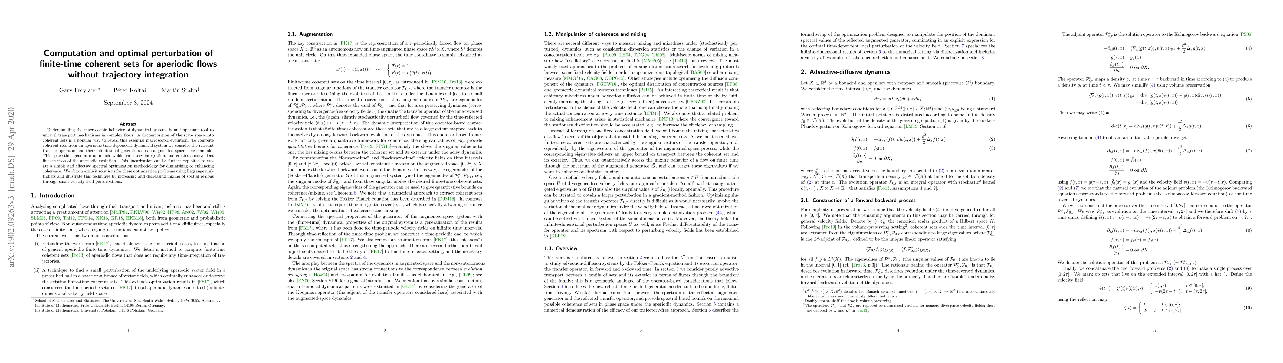 This paper proposes a method for computing and optimizing coherent sets in aperiodic dynamical systems without relying on trajectory integration. It utilizes transfer operators and spectral optimization to enhance or diminish coherence through small perturbations, illustrated by modifying mixing in spatial regions.