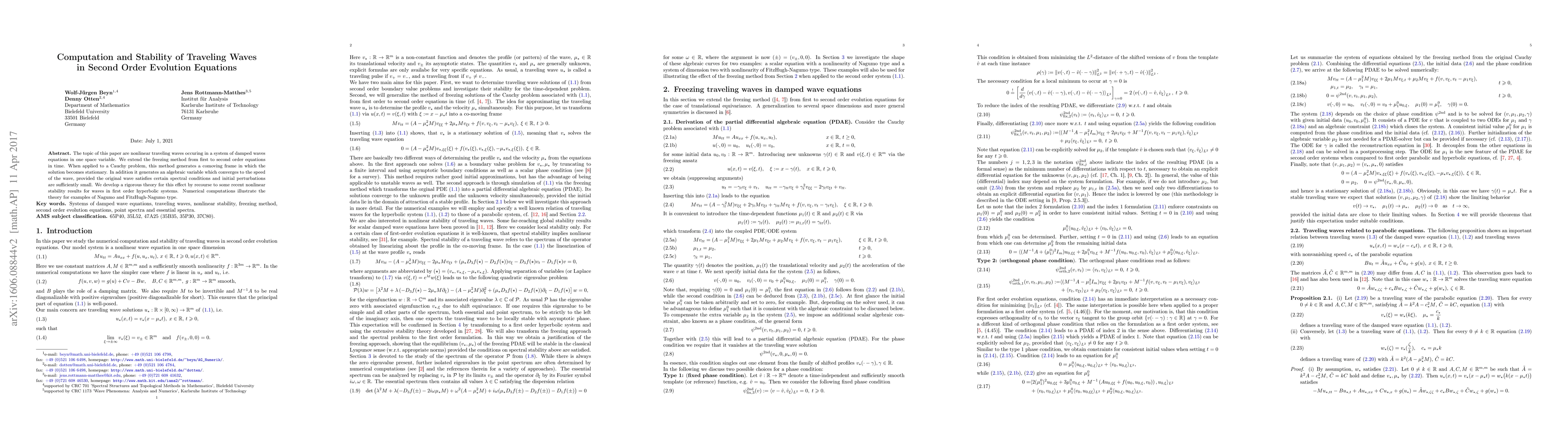 This paper explores nonlinear traveling waves in damped wave equations using an extended freezing method, which transforms the problem into a stationary frame and determines wave speed under certain conditions. It combines theoretical stability results with numerical examples to validate the approach.