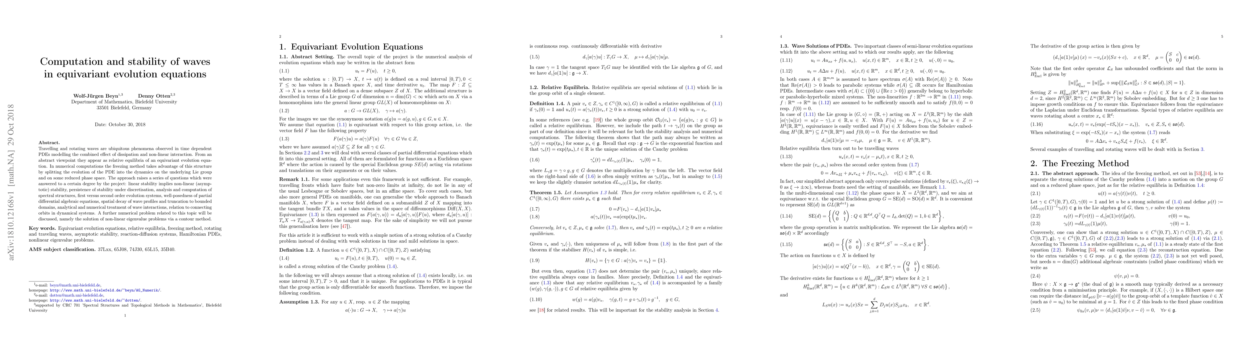Travelling and rotating waves are ubiquitous phenomena observed in time dependent PDEs modelling the combined effect of dissipation and non-linear interaction. From an abstract viewpoint they appear as relative equilibria of an equivariant evolution equa- tion. In numerical computations the freezing method takes advantage of this structure by splitting the evolution of the PDE into the dynamics on the underlying Lie group and on some reduced phase space. The approach raises a series of questions which were answered to a certain degree by the project: linear stability implies non-linear (asymp- totic) stability, persistence of stability under discretisation, analysis and computation of spectral structures, first versus second order evolution systems, well-posedness of partial differential algebraic equations, spatial decay of wave profiles and truncation to bounded domains, analytical and numerical treatment of wave interactions, relation to connecting orbits in dynamical systems. A further numerical problem related to this topic will be discussed, namely the solution of non-linear eigenvalue problems via a contour method.