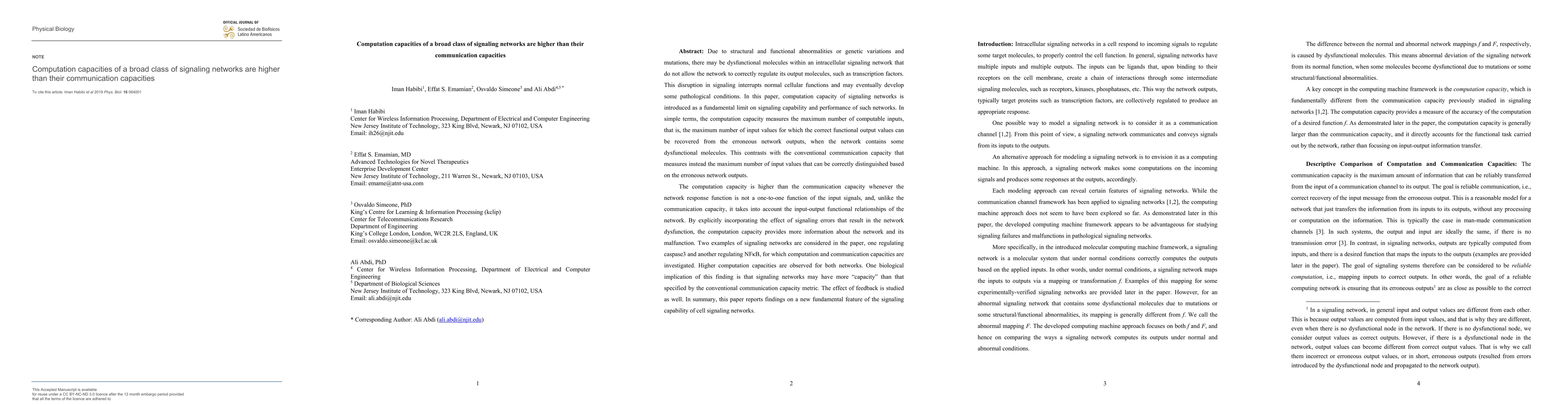 Due to structural and functional abnormalities or genetic variations and mutations, there may be dysfunctional molecules within an intracellular signaling network that do not allow the network to correctly regulate its output molecules, such as transcription factors. This disruption in signaling interrupts normal cellular functions and may eventually develop some pathological conditions. In this paper, computation capacity of signaling networks is introduced as a fundamental limit on signaling capability and performance of such networks. The computation capacity measures the maximum number of computable inputs, that is, the maximum number of input values for which the correct functional output values can be recovered from the erroneous network outputs, when the network contains some dysfunctional molecules. This contrasts with the conventional communication capacity that measures instead the maximum number of input values that can be correctly distinguished based on the erroneous network outputs. The computation capacity is higher than the communication capacity, if the network response function is not a one-to-one function of the input signals. By explicitly incorporating the effect of signaling errors that result in the network dysfunction, the computation capacity provides more information about the network and its malfunction. Two examples of signaling networks are studied here, one regulating caspase3 and another regulating NFkB, for which computation and communication capacities are analyzed. Higher computation capacities are observed for both networks. One biological implication of this finding is that signaling networks may have more capacity than that specified by the conventional communication capacity metric. The effect of feedback is also studied. In summary, this paper reports findings on a new fundamental feature of the signaling capability of cell signaling networks.