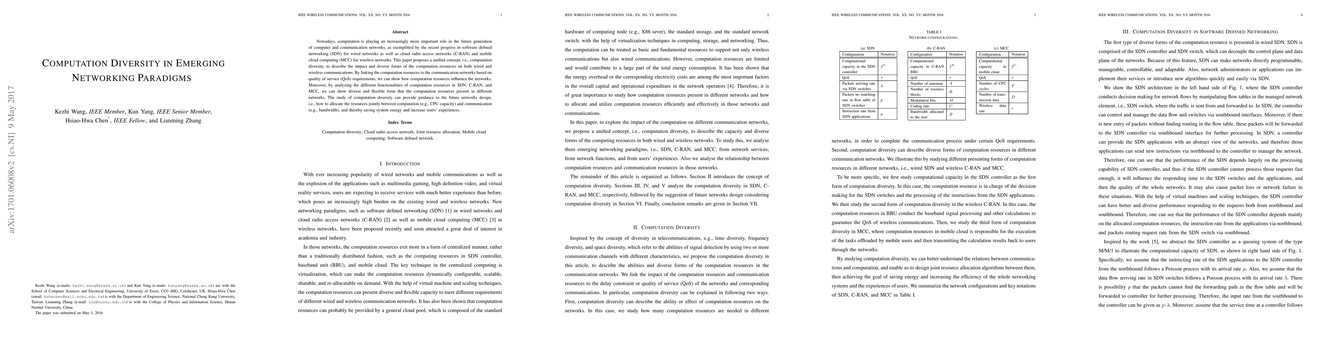 Nowadays, computation is playing an increasingly more important role in the future generation of computer and communication networks, as exemplified by the recent progress in software defined networking (SDN) for wired networks as well as cloud radio access networks (C-RAN) and mobile cloud computing (MCC) for wireless networks. This paper proposes a unified concept, i.e., computation diversity, to describe the impact and diverse forms of the computation resources on both wired and wireless communications. By linking the computation resources to the communication networks based on quality of service (QoS) requirements, we can show how computation resources influence the networks. Moreover, by analyzing the different functionalities of computation resources in SDN, C-RAN, and MCC, we can show diverse and flexible form that the computation resources present in different networks. The study of computation diversity can provide guidance to the future networks design, i.e., how to allocate the resources jointly between computation (e.g., CPU capacity) and communication (e.g., bandwidth), and thereby saving system energy and increase users' experiences.