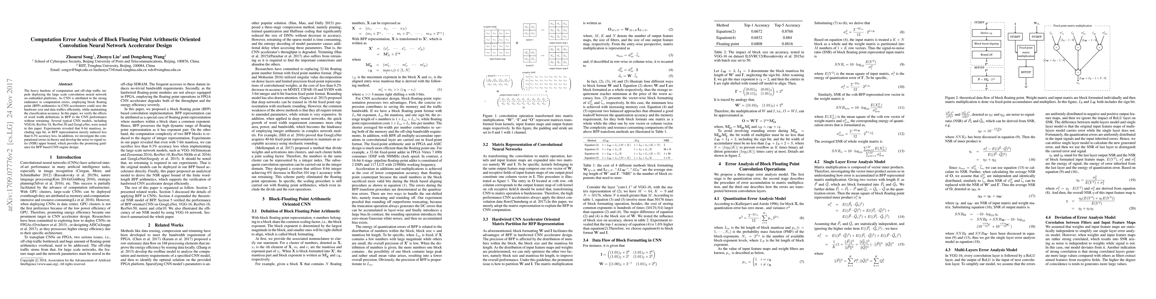The heavy burdens of computation and off-chip traffic impede deploying the large scale convolution neural network on embedded platforms. As CNN is attributed to the strong endurance to computation errors, employing block floating point (BFP) arithmetics in CNN accelerators could save the hardware cost and data traffics efficiently, while maintaining the classification accuracy. In this paper, we verify the effects of word width definitions in BFP to the CNN performance without retraining. Several typical CNN models, including VGG16, ResNet-18, ResNet-50 and GoogLeNet, were tested in this paper. Experiments revealed that 8-bit mantissa, including sign bit, in BFP representation merely induced less than 0.3% accuracy loss. In addition, we investigate the computational errors in theory and develop the noise-to-signal ratio (NSR) upper bound, which provides the promising guidance for BFP based CNN engine design.