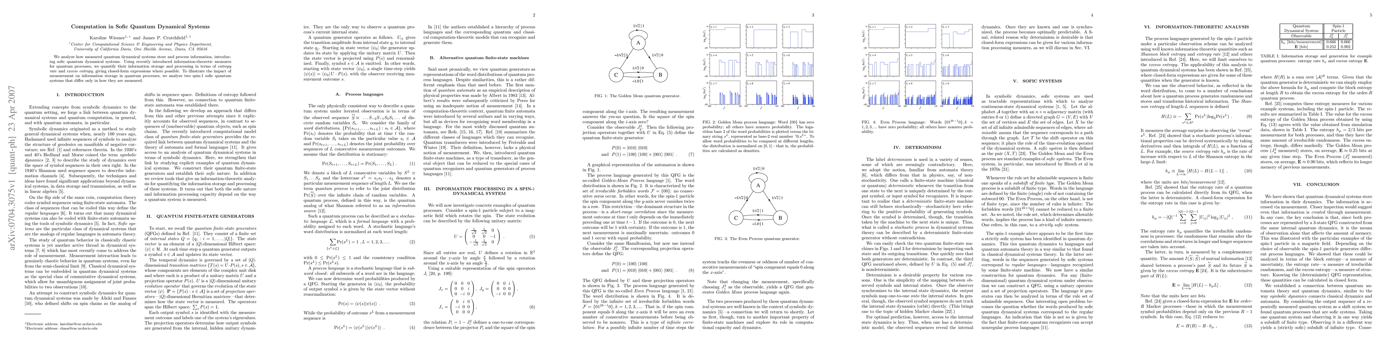 This paper introduces sofic quantum dynamical systems to analyze information storage and processing in measured quantum systems. It quantifies these processes using entropy rate and excess entropy, providing closed-form expressions where feasible and illustrating the impact of measurement through two spin-1 systems.