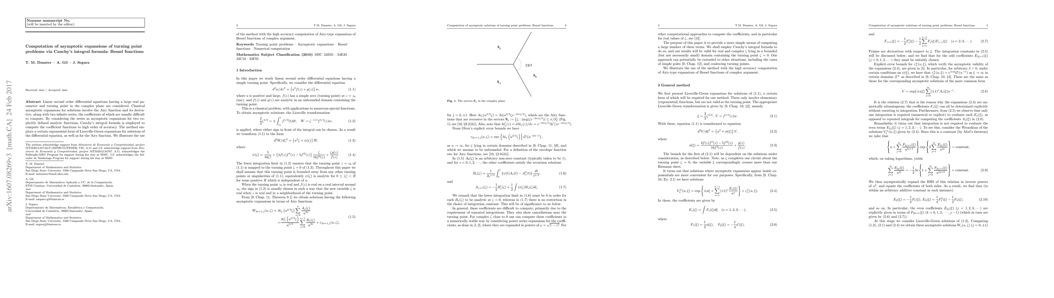 This paper develops a method using Cauchy's integral formula to compute asymptotic expansions for solutions of linear second-order differential equations with large parameters, focusing on turning points in the complex plane. The method provides high-accuracy coefficients for the expansions, illustrated through the computation of Airy-type expansions of Bessel functions.