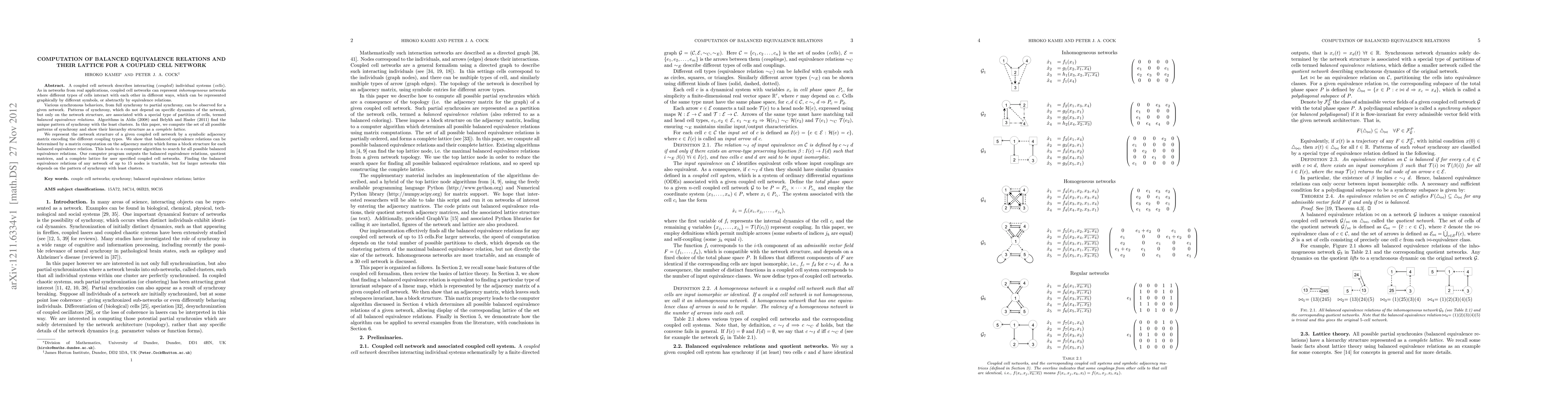 A coupled cell network describes interacting (coupled) individual systems (cells). As in networks from real applications, coupled cell networks can represent inhomogeneous networks where different types of cells interact with each other in different ways, which can be represented graphically by different symbols, or abstractly by equivalence relations. Various synchronous behaviors, from full synchrony to partial synchrony, can be observed for a given network. Patterns of synchrony, which do not depend on specific dynamics of the network, but only on the network structure, are associated with a special type of partition of cells, termed balanced equivalence relations. Algorithms in Aldis (2008) and Belykh and Hasler (2011) find the unique pattern of synchrony with the least clusters. In this paper, we compute the set of all possible patterns of synchrony and show their hierarchy structure as a complete lattice. We represent the network structure of a given coupled cell network by a symbolic adjacency matrix encoding the different coupling types. We show that balanced equivalence relations can be determined by a matrix computation on the adjacency matrix which forms a block structure for each balanced equivalence relation. This leads to a computer algorithm to search for all possible balanced equivalence relations. Our computer program outputs the balanced equivalence relations, quotient matrices, and a complete lattice for user specified coupled cell networks. Finding the balanced equivalence relations of any network of up to 15 nodes is tractable, but for larger networks this depends on the pattern of synchrony with least clusters.