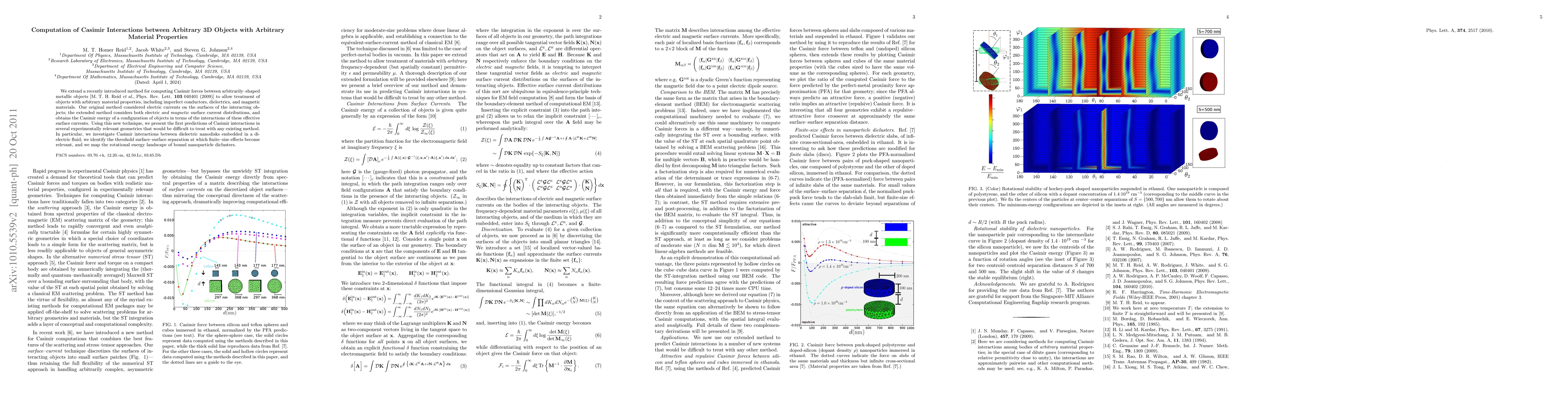 We extend a recently introduced method for computing Casimir forces between arbitrarily--shaped metallic objects [M. T. H. Reid et al., Phys. Rev. Lett._103_ 040401 (2009)] to allow treatment of objects with arbitrary material properties, including imperfect conductors, dielectrics, and magnetic materials. Our original method considered electric currents on the surfaces of the interacting objects; the extended method considers both electric and magnetic surface current distributions, and obtains the Casimir energy of a configuration of objects in terms of the interactions of these effective surface currents. Using this new technique, we present the first predictions of Casimir interactions in several experimentally relevant geometries that would be difficult to treat with any existing method. In particular, we investigate Casimir interactions between dielectric nanodisks embedded in a dielectric fluid; we identify the threshold surface--surface separation at which finite--size effects become relevant, and we map the rotational energy landscape of bound nanoparticle diclusters.