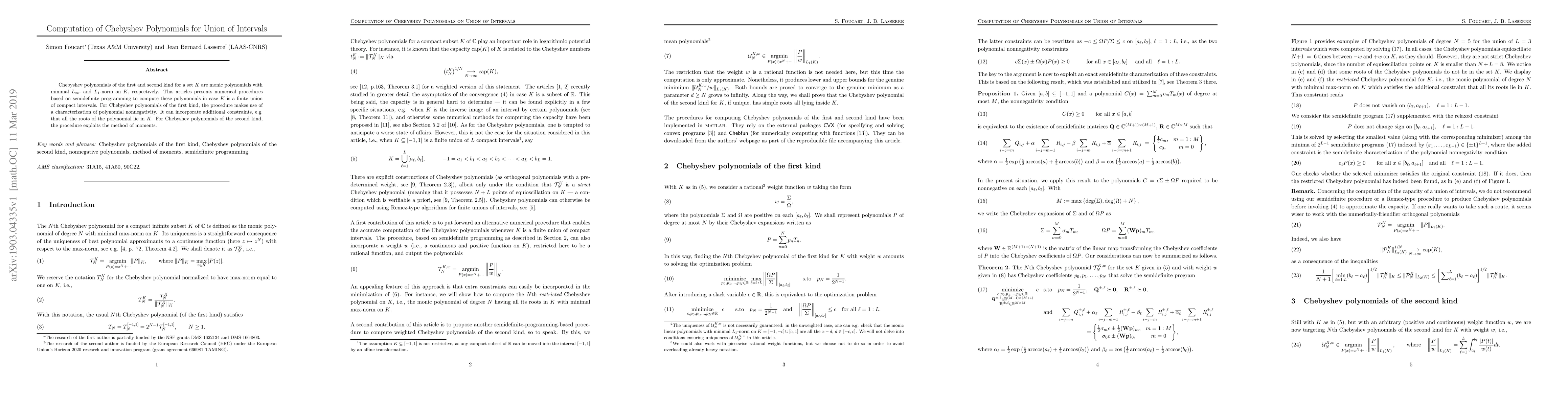Chebyshev polynomials of the first and second kind for a set K are monic polynomials with minimal L $\infty$-and L 1-norm on K, respectively. This articles presents numerical procedures based on semidefinite programming to compute these polynomials in case K is a finite union of compact intervals. For Chebyshev polynomials of the first kind, the procedure makes use of a characterization of polynomial nonnegativity. It can incorporate additional constraints, e.g. that all the roots of the polynomial lie in K. For Chebyshev polynomials of the second kind, the procedure exploits the method of moments. Key words and phrases: Chebyshev polynomials of the first kind, Chebyshev polynomials of the second kind, nonnegative polynomials, method of moments, semidefinite programming.