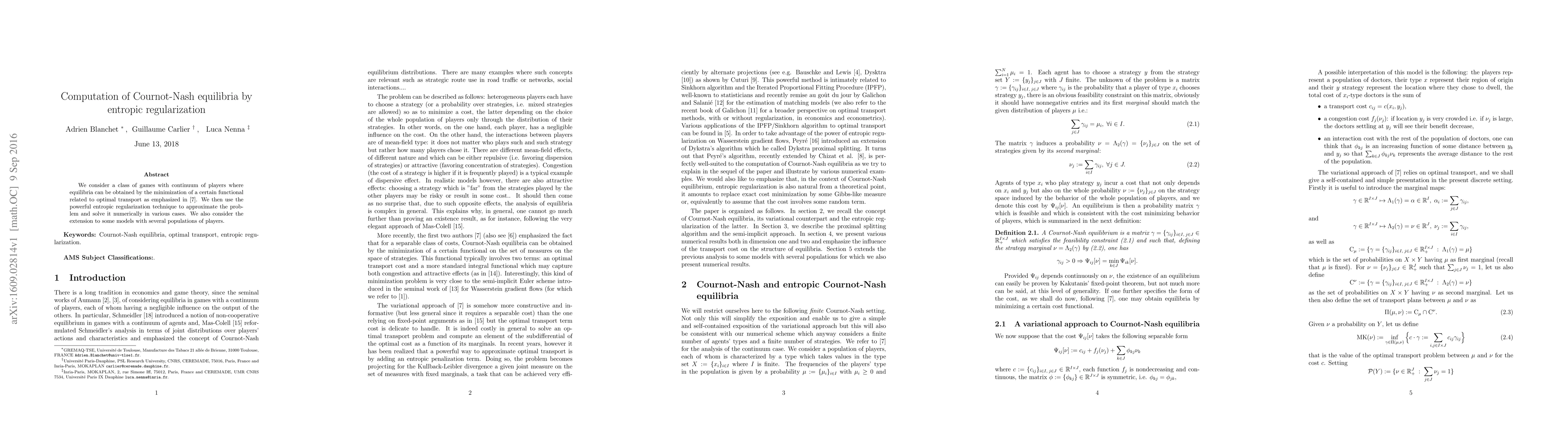The paper employs entropic regularization to approximate and solve numerically Cournot-Nash equilibria in games with a continuum of players, utilizing the optimal transport theory and a proximal splitting algorithm.