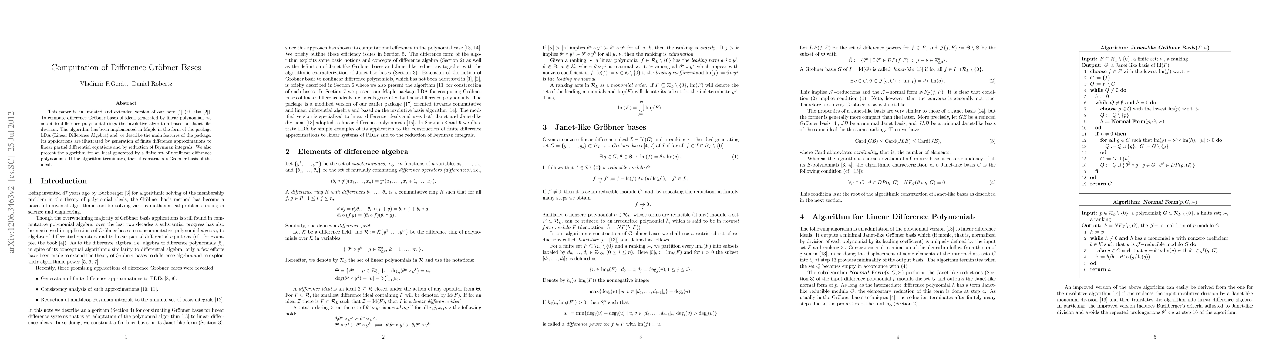This paper presents an algorithm for computing difference Groebner bases in difference polynomial rings using an involutive method based on Janet-like division. The algorithm is implemented in Maple as part of the LDA package, and its applications include solving linear partial differential equations and reducing Feynman integrals.