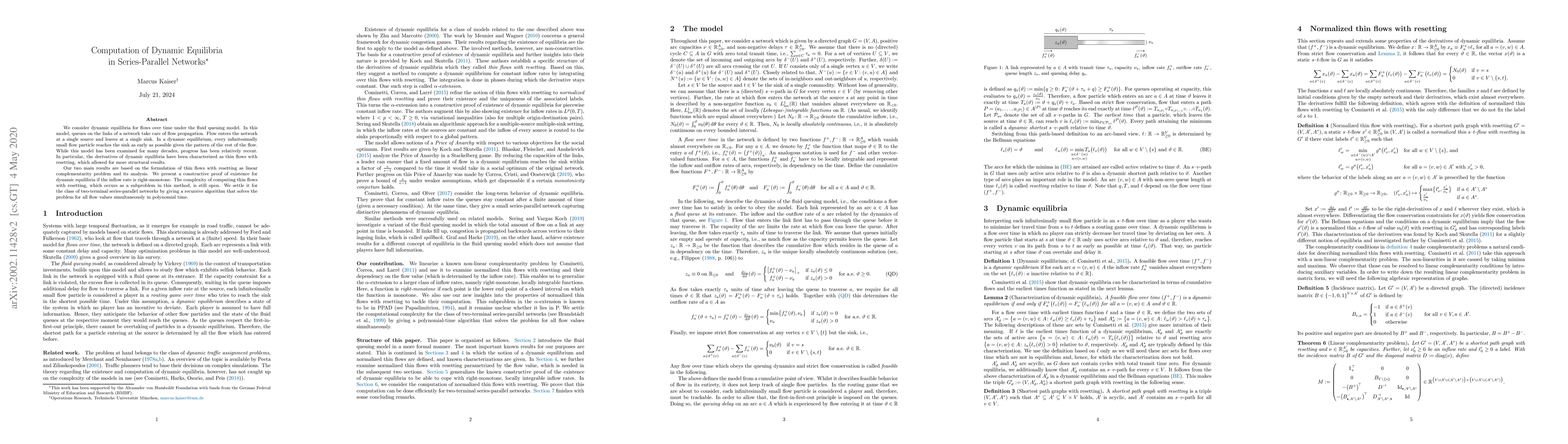 This paper investigates dynamic equilibria in series-parallel networks under the fluid queuing model, proving the existence of equilibria under right-monotone inflow rates. The authors also develop a polynomial-time recursive algorithm to compute thin flows with resetting for two-terminal series-parallel networks.