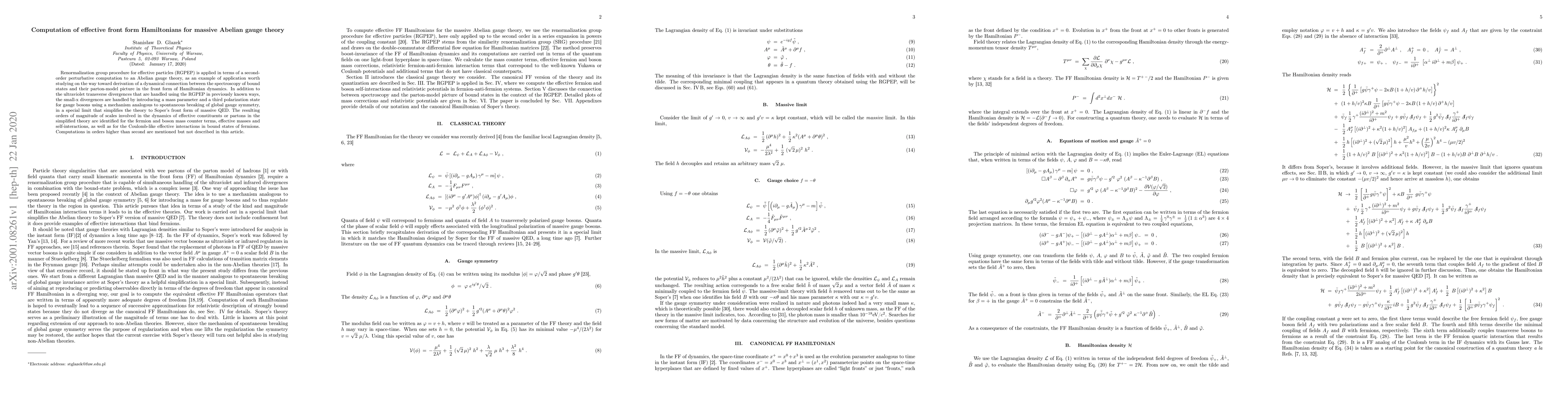 This paper applies the Renormalization Group Procedure for Effective Particles (RGPEP) to an Abelian gauge theory, handling both ultraviolet and small-x divergences. It introduces a mass parameter and a third polarization state for gauge bosons, simplifying the theory to Soper's front form of massive QED, identifying key scales in the dynamics of effective constituents or partons.
