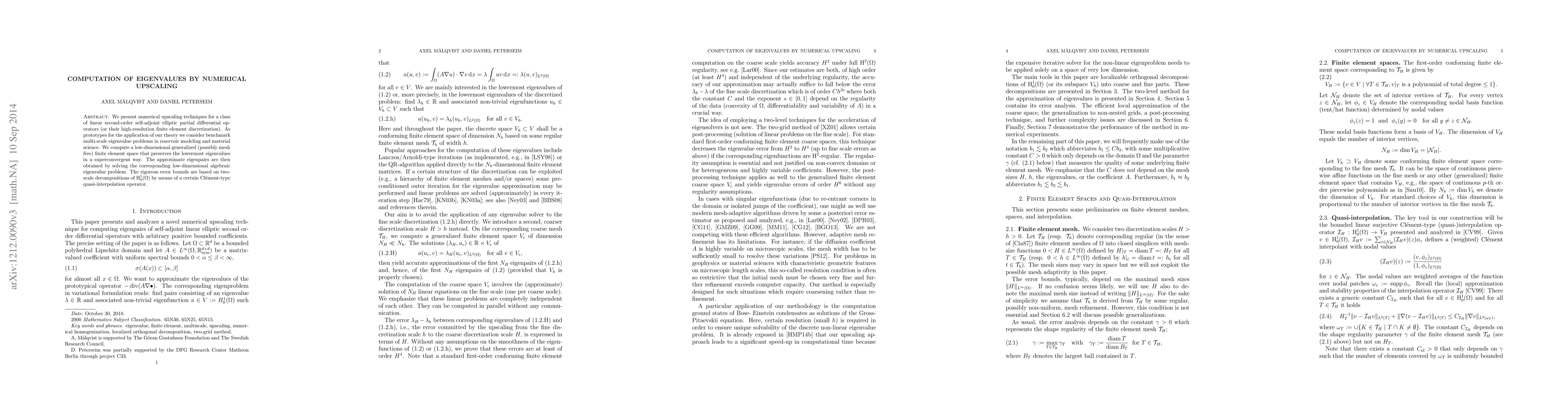 We present numerical upscaling techniques for a class of linear second-order self-adjoint elliptic partial differential operators (or their high-resolution finite element discretization). As prototypes for the application of our theory we consider benchmark multi-scale eigenvalue problems in reservoir modeling and material science. We compute a low-dimensional generalized (possibly mesh free) finite element space that preserves the lowermost eigenvalues in a superconvergent way. The approximate eigenpairs are then obtained by solving the corresponding low-dimensional algebraic eigenvalue problem. The rigorous error bounds are based on two-scale decompositions of $H^1_0(\Omega)$ by means of a certain Cl\'ement-type quasi-interpolation operator.