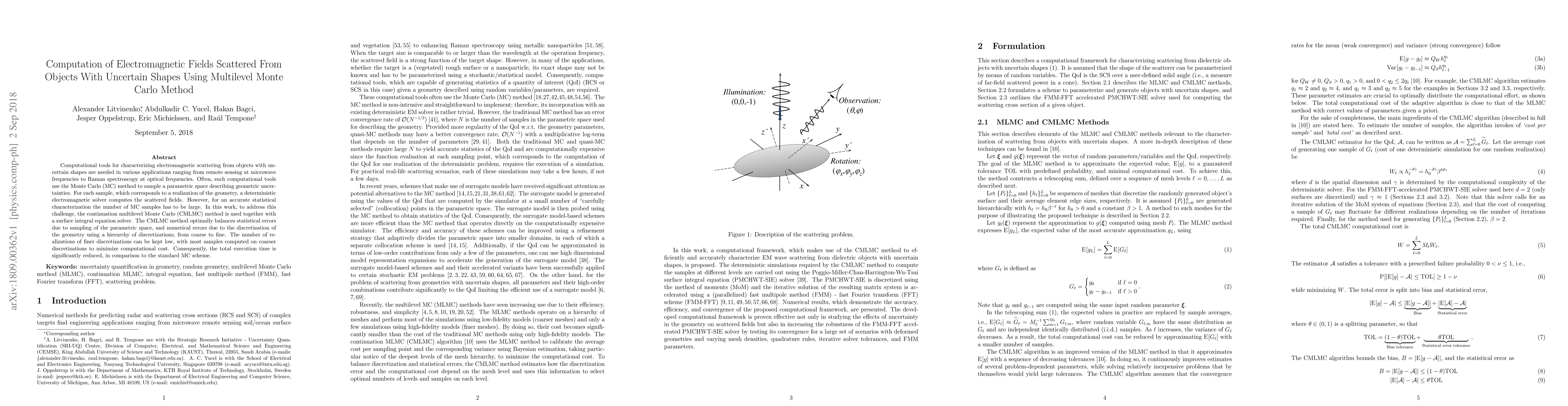 This paper introduces a method to compute electromagnetic fields scattered from objects with uncertain shapes using a multilevel Monte Carlo approach, reducing computational cost while maintaining accurate statistical characterization.