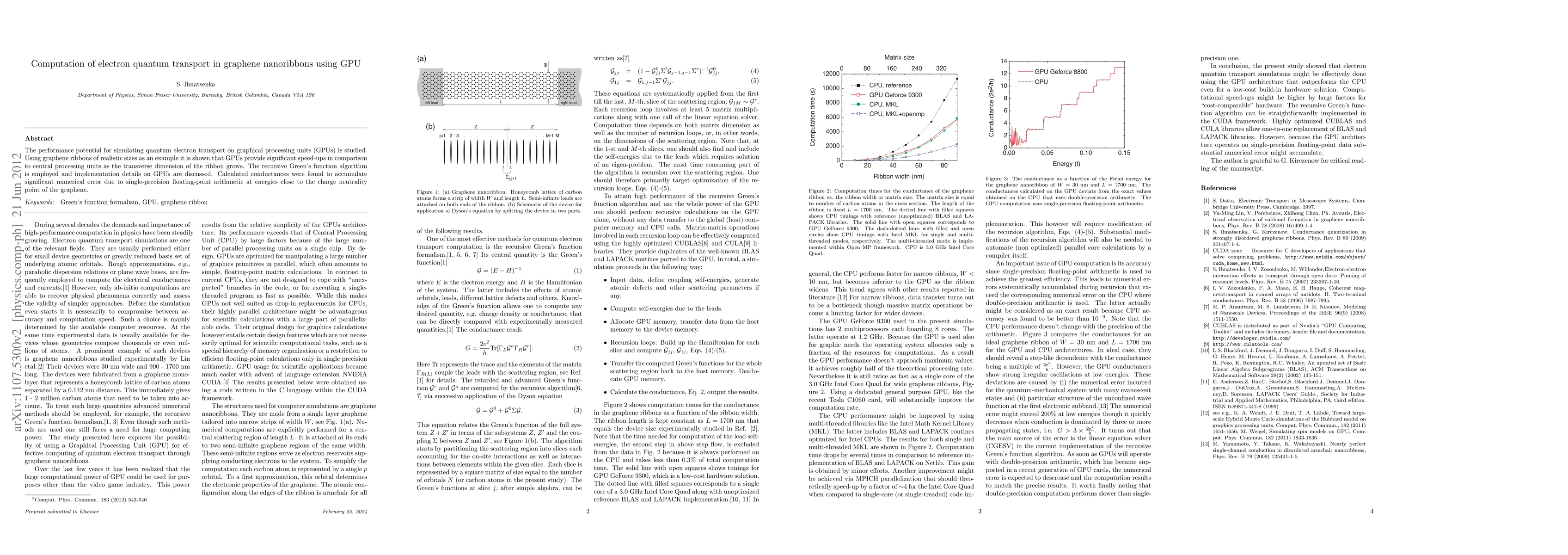 This paper investigates the use of GPUs for simulating quantum electron transport in graphene nanoribbons, demonstrating significant speed-ups over CPUs as ribbon width increases. However, single-precision floating-point arithmetic near the charge neutrality point leads to substantial numerical errors in calculated conductances.