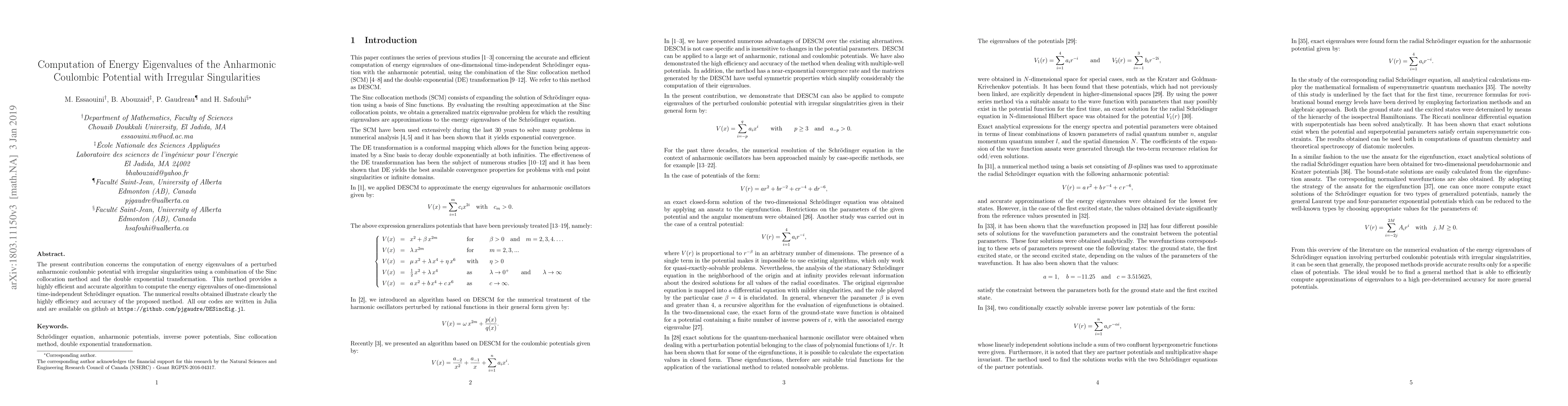 The present contribution concerns the computation of energy eigenvalues of a perturbed anharmonic coulombic potential with irregular singularities using a combination of the Sinc collocation method and the double exponential transformation. This method provides a highly efficient and accurate algorithm to compute the energy eigenvalues of one-dimensional time-independent Schr\"odinger equation. The numerical results obtained illustrate clearly the highly efficiency and accuracy of the proposed method. All our codes are written in Julia and are available on github at \url{https://github.com/pjgaudre/DESincEig.jl}.