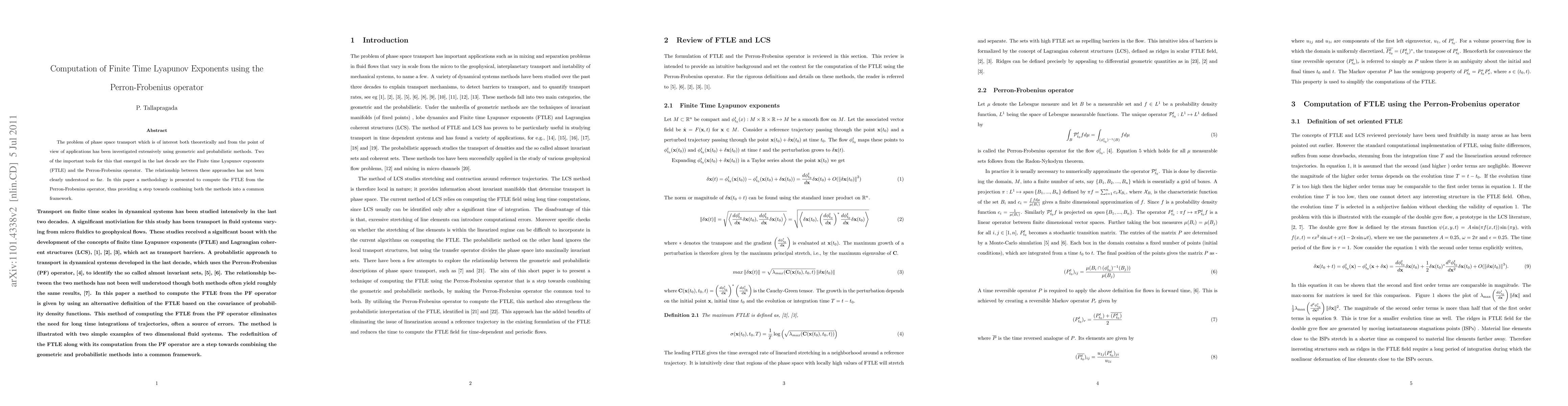 This paper presents a methodology to compute the Finite Time Lyapunov Exponents (FTLE) using the Perron-Frobenius operator, aiming to integrate geometric and probabilistic methods for phase space transport analysis. This approach bridges the gap between FTLE and the Perron-Frobenius operator, facilitating a unified framework for theoretical and applied investigations.