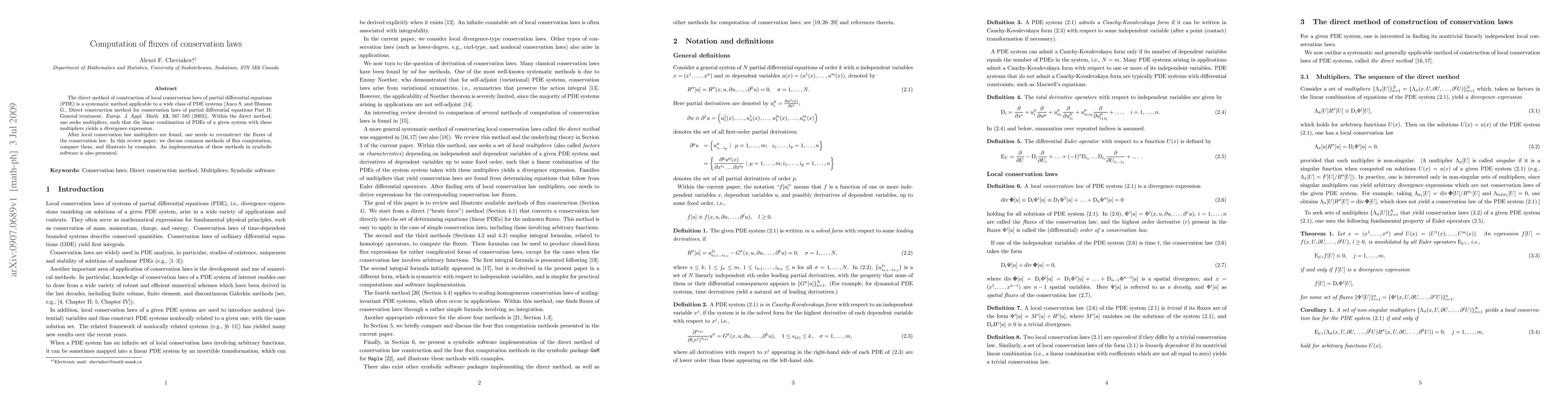 This paper reviews methods for computing fluxes of local conservation laws derived from partial differential equations (PDEs) using the direct construction method. It compares various computational techniques and demonstrates their implementation in symbolic software through examples.