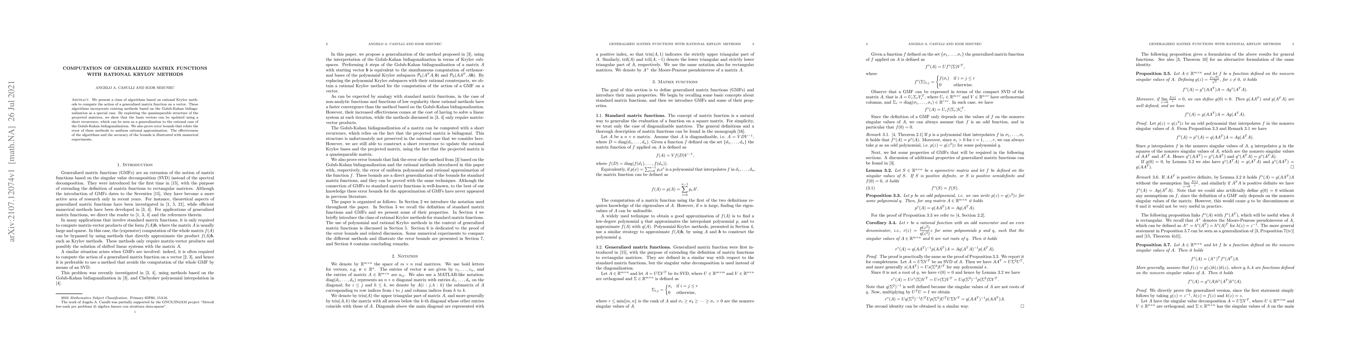 This paper introduces a new class of algorithms using rational Krylov methods to compute generalized matrix functions, generalizing the Golub-Kahan bidiagonalization. It demonstrates efficient updates through quasiseparable structures and provides error bounds linked to uniform rational approximation, validated by numerical experiments.