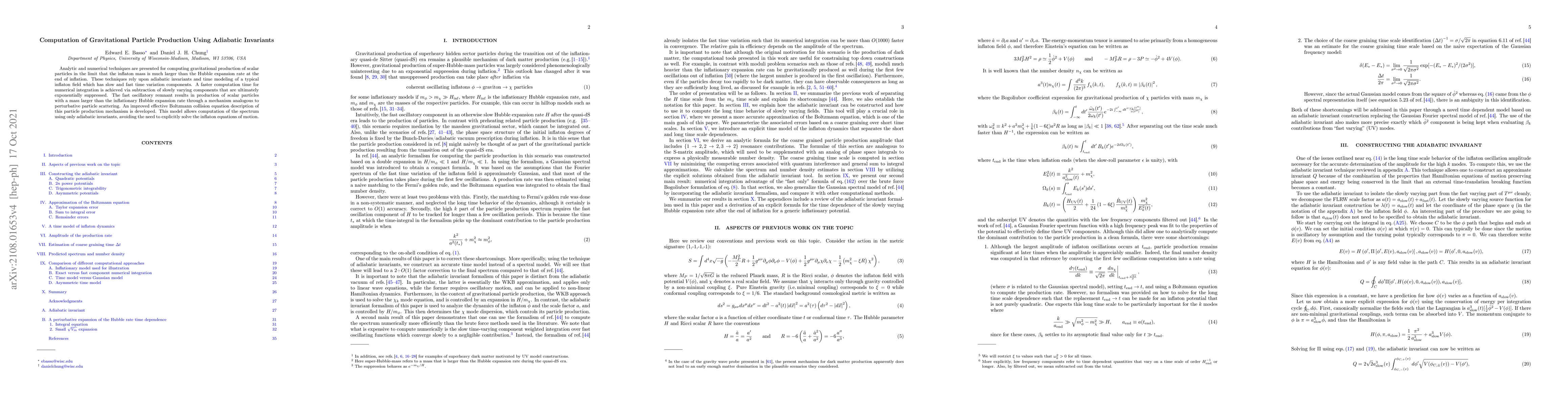 Analytic and numerical techniques are presented for computing gravitational production of scalar particles in the limit that the inflaton mass is much larger than the Hubble expansion rate at the end of inflation. These techniques rely upon adiabatic invariants and time modeling of a typical inflaton field which has slow and fast time variation components. A faster computation time for numerical integration is achieved via subtraction of slowly varying components that are ultimately exponentially suppressed. The fast oscillatory remnant results in production of scalar particles with a mass larger than the inflationary Hubble expansion rate through a mechanism analogous to perturbative particle scattering. An improved effective Boltzmann collision equation description of this particle production mechanism is developed. This model allows computation of the spectrum using only adiabatic invariants, avoiding the need to explicitly solve the inflaton equations of motion.