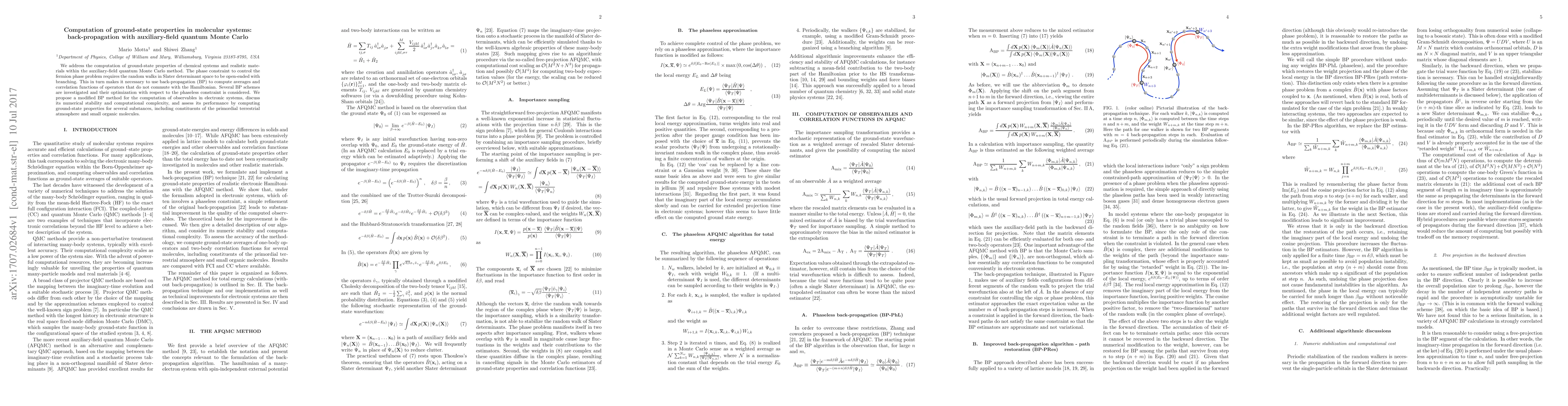 This paper proposes an optimized back-propagation method within the auxiliary-field quantum Monte Carlo framework to compute ground-state properties of molecular systems. It investigates various back-propagation schemes and assesses their performance in calculating observables, demonstrating stability and efficiency for substances like atmospheric gases and small organic molecules.