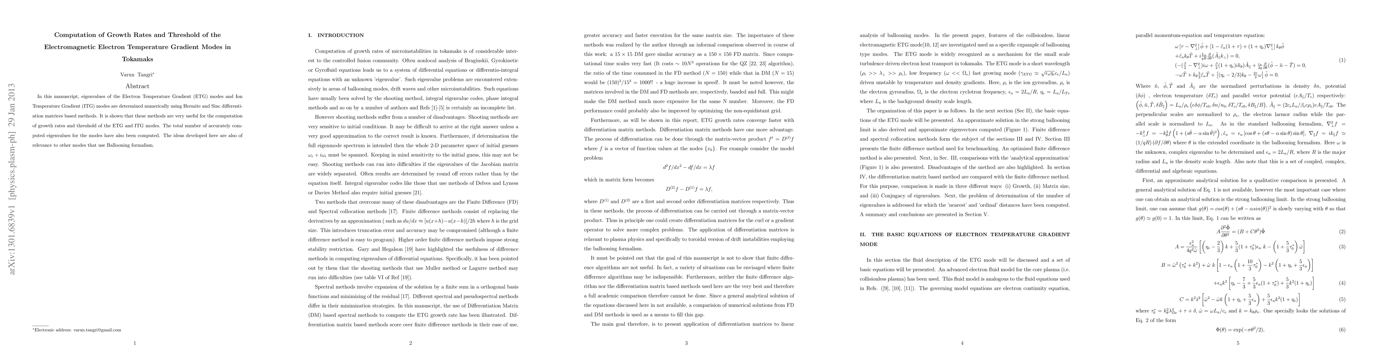 In this manuscript, eigenvalues of the Electron Temperature Gradient (ETG) modes and Ion Temperature Gradient (ITG) modes are determined numerically using Hermite and Sinc differentiation matrices based methods. It is shown that these methods are very useful for the computation of growth rates and threshold of the ETG and ITG modes. The total number of accurately computed eigenvalues for the modes have also been computed. The ideas developed here are also of relevance to other modes that use Ballooning formalism.