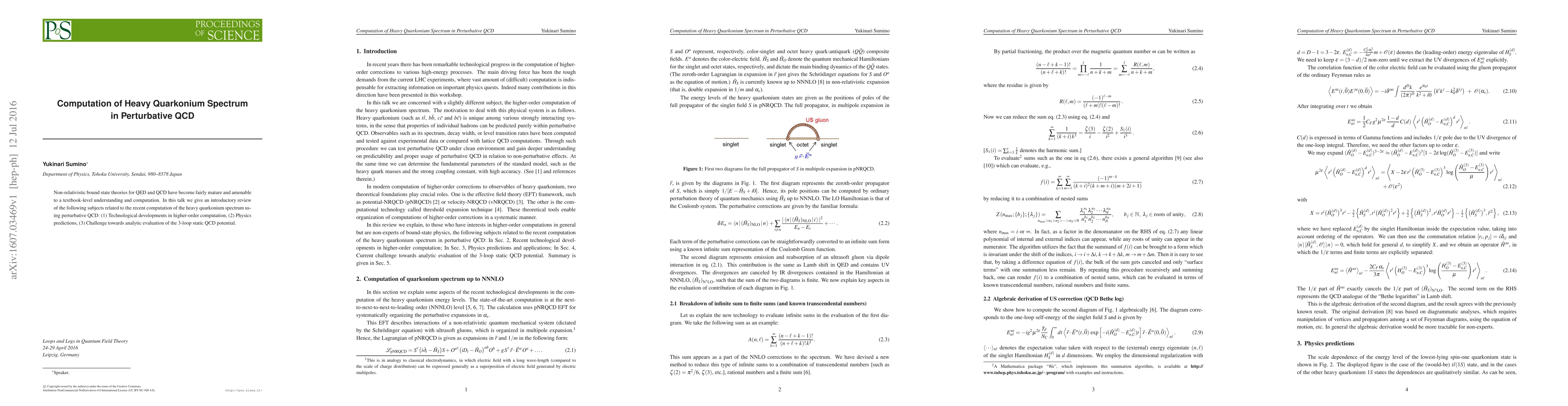 Non-relativistic bound state theories for QED and QCD have become fairly mature and amenable to a textbook-level understanding and computation. In this talk we give an introductory review of the following subjects related to the recent computation of the heavy quarkonium spectrum using perturbative QCD: (1) Technological developments in higher-order computation, (2) Physics predictions, (3) Challenge towards analytic evaluation of the 3-loop static QCD potential.