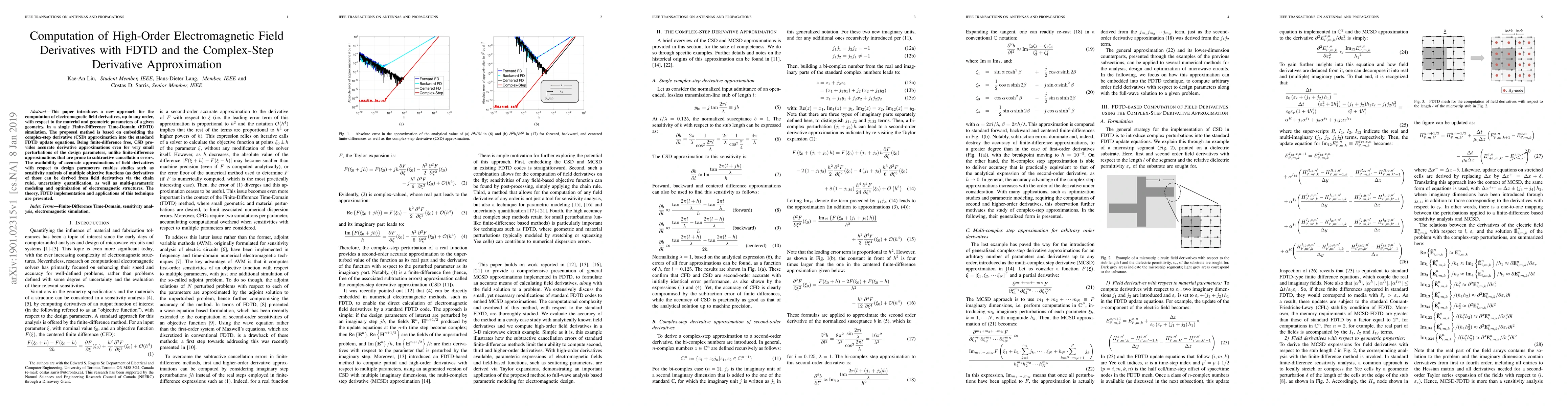 This paper introduces a new approach for the computation of electromagnetic field derivatives, up to any order, with respect to the material and geometric parameters of a given geometry, in a single Finite-Difference Time-Domain (FDTD) simulation. The proposed method is based on embedding the complex-step derivative (CSD) approximation into the standard FDTD update equations. Being finite-difference free, CSD provides accurate derivative approximations even for very small perturbations of the design parameters, unlike finite-difference approximations that are prone to subtractive cancellation errors. The availability of accurate approximations of field derivatives with respect to design parameters enables studies such as sensitivity analysis of multiple objective functions (as derivatives of those can be derived from field derivatives via the chain rule), uncertainty quantification, as well as multi-parametric modeling and optimization of electromagnetic structures. The theory, FDTD implementation and applications of this technique are presented.