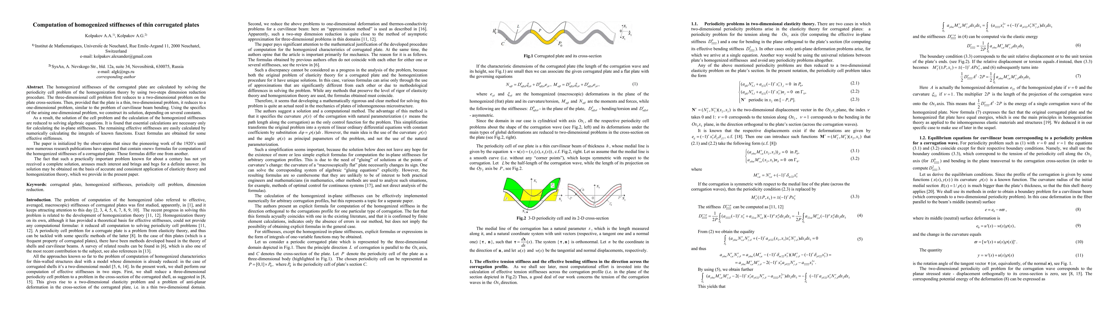The homogenized stiffnesses of a corrugated plate are calculated by solving the periodicity cell problem of the homogenization theory by using two-steps dimension reduction procedure. The three-dimensional periodicity cell problem first reduces to a two-dimensional problem on the plate cross-sections. Then, provided that the plate is thin, the two-dimensional problem reduces to a one-dimensional problem, similar to the problem of curvilinear beam bending. Using the specifics of the arising one-dimensional problem, we construct its solution, depending on several constants. As a result, the solution of the cell problem and the calculation of the homogenized stiffnesses are reduced to solving algebraic equations. It is found that essential calculations are necessary only for finding the tension stiffness in the direction orthogonal to the corrugation profile. The remaining effective stiffnesses are easily calculated by numerically computing integrals of known functions. For some effective stiffnesses exact formulas are obtained.