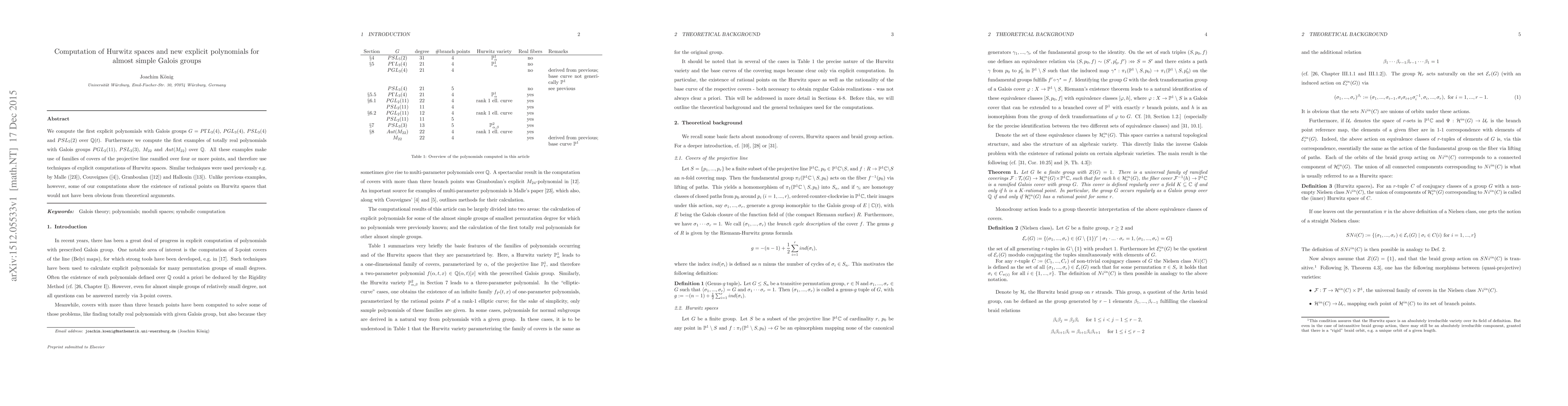 We compute the first explicit polynomials with Galois groups $G=P\Gamma L_3(4)$, $PGL_3(4)$, $PSL_3(4)$ and $PSL_5(2)$ over $\mathbb{Q}(t)$. Furthermore we compute the first examples of totally real polynomials with Galois groups $PGL_2(11)$, $PSL_3(3)$, $M_{22}$ and $Aut(M_{22})$ over $\mathbb{Q}$. All these examples make use of families of covers of the projective line ramified over four or more points, and therefore use techniques of explicit computations of Hurwitz spaces. Similar techniques were used previously e.g. by Malle, Couveignes, Granboulan and Hallouin. Unlike previous examples, however, some of our computations show the existence of rational points on Hurwitz spaces that would not have been obvious from theoretical arguments.
