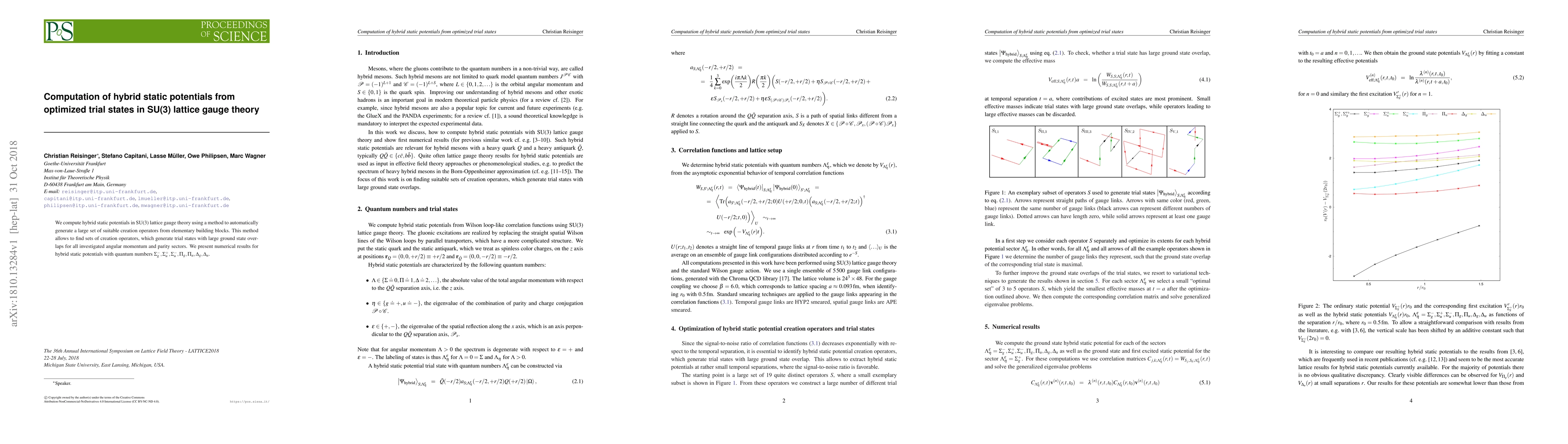 Researchers in SU(3) lattice gauge theory developed a method to generate trial states with high ground state overlaps, allowing them to calculate hybrid static potentials for various quantum numbers. The study presents numerical results for six different quark-antiquark combinations.