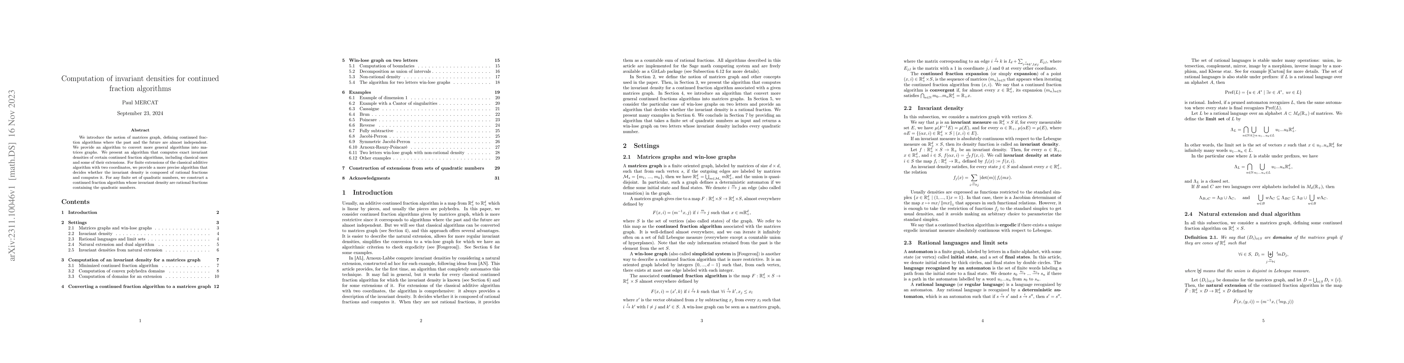 This paper introduces matrices graphs to model continued fraction algorithms and presents an algorithm to compute exact invariant densities for these algorithms, including classical and extended versions. It also provides a refined algorithm for finite extensions of the classical additive algorithm and constructs continued fraction algorithms with rational fractions containing specific quadratic numbers.
