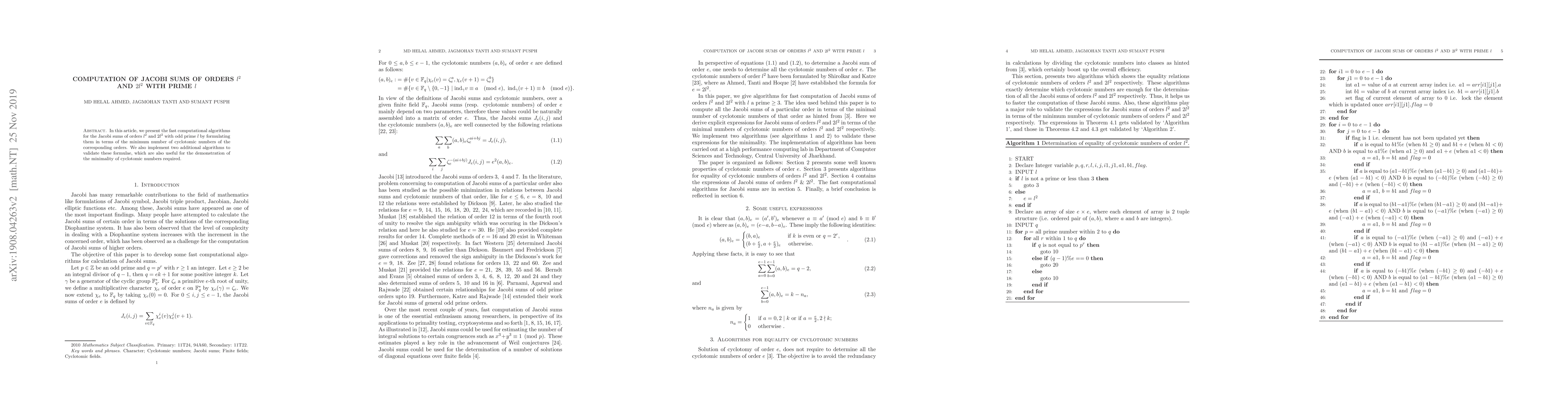 This paper develops efficient algorithms for computing Jacobi sums of orders $l^2$ and $2l^2$ with an odd prime $l$, expressing them in terms of the minimum number of cyclotomic numbers. It also includes validation algorithms to demonstrate the minimality of these cyclotomic numbers.
