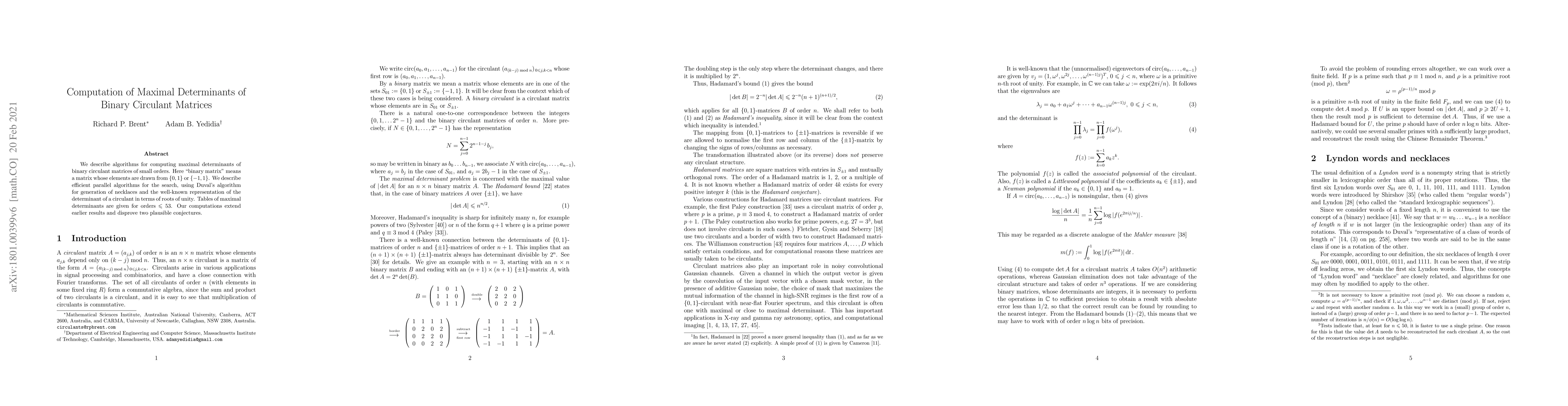 This paper presents efficient parallel algorithms for computing maximal determinants of binary circulant matrices, utilizing Duval's necklace generation algorithm and determinant properties. It extends previous results and disproves two conjectures, providing tables of maximal determinants for orders up to 53.