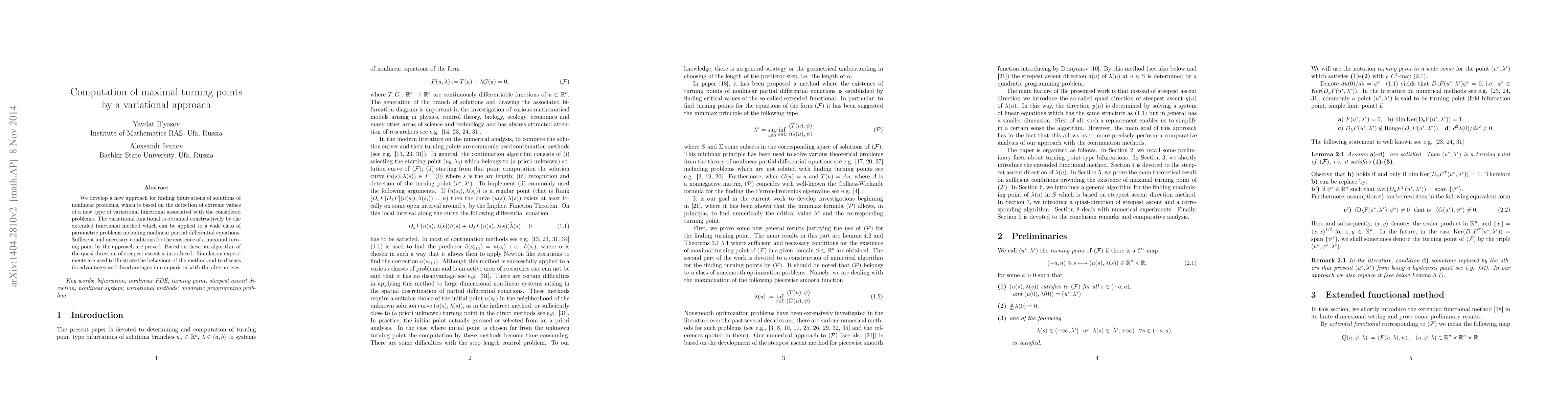 This paper introduces a novel variational approach to detect bifurcations in nonlinear problems by identifying extreme values of a new type of variational functional. The method, applicable to various parametric problems, provides geometric insights and an algorithm for finding maximal turning points, supported by theoretical proofs and simulation experiments.