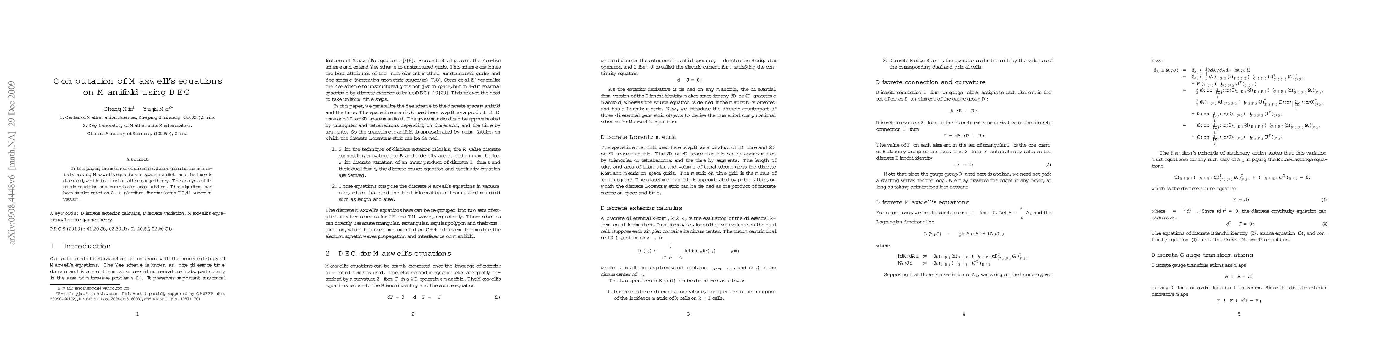 In this paper, the method of discrete exterior calculus for numerically solving Maxwell's equations in space manifold and the time is discussed, which is a kind of lattice gauge theory. The analysis of its stable condition and error is also accomplished. This algorithm has been implemented on C++ plateform for simulating TE/M waves in vacuum.